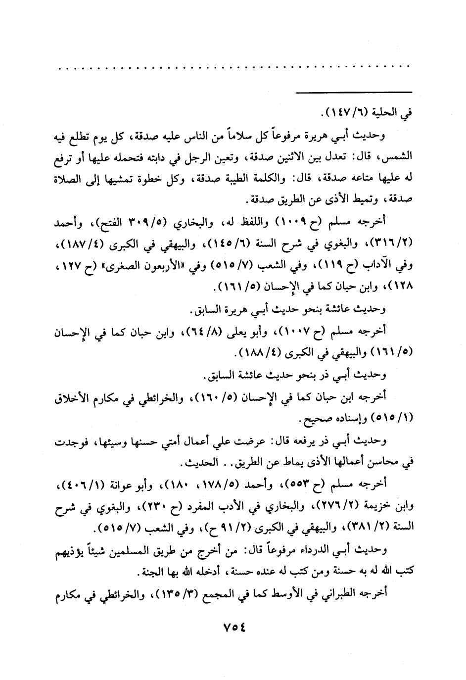 وحديث أبي هريرة مرفوعًا كل سلامًا من الناس عليه صدقة، كل يوم تطلع فيه الشمس، قال: تعدل بين الاثنين صدقة، وتعين الرجل في دابته فتحمله عليها أو ترفع له عليها متاعه صدقة، قال: والكلمة الطيبة صدقة، وكل خطوة تمشيها إلى الصلاة صدقة، وتميط الأذى عن الطريق صدقة.