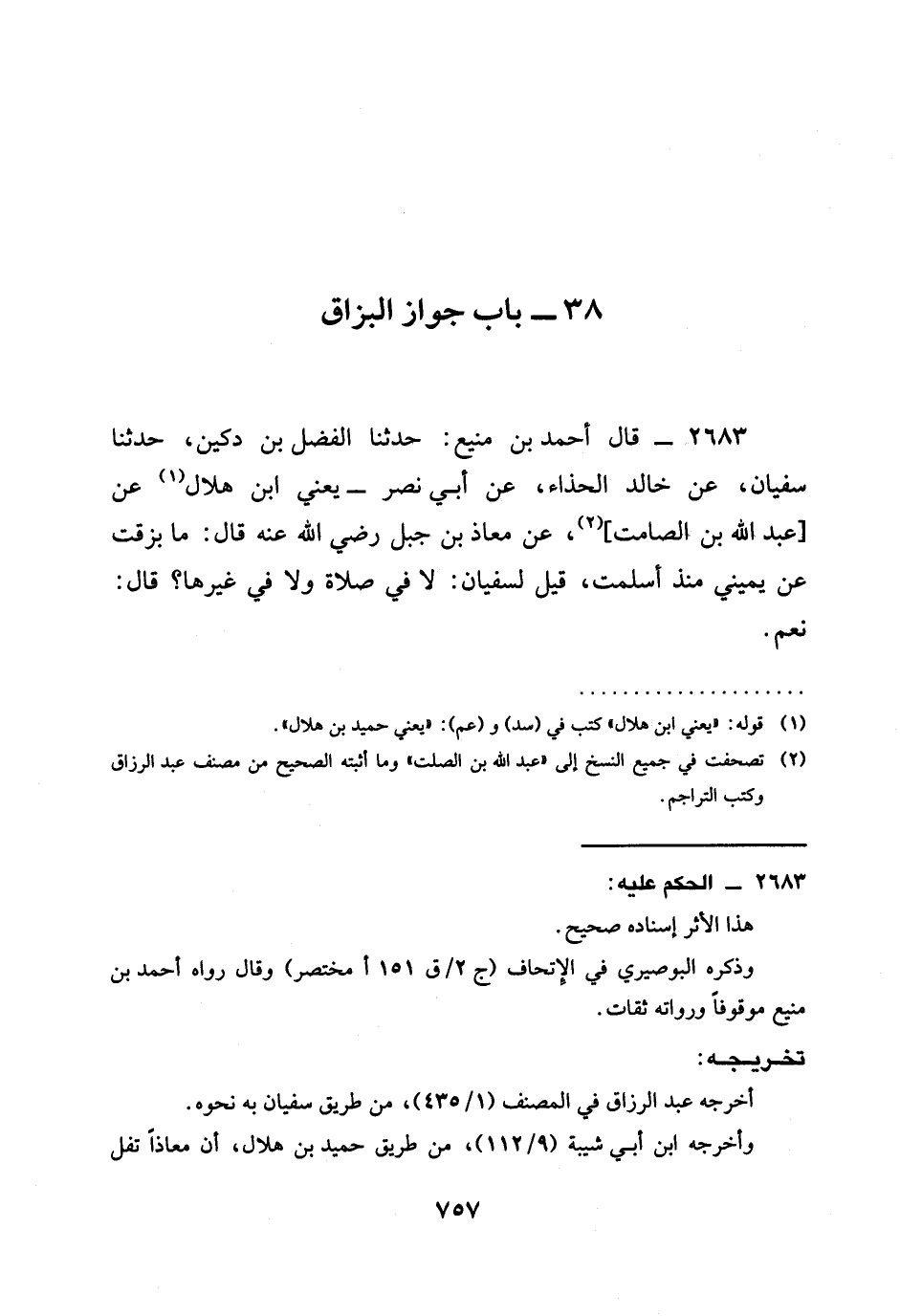 2683 - قَالَ أَحْمَدُ بْنُ مَنِيعٍ: حَدَّثَنَا الْفَضْلُ بْنُ دُكَيْنٍ، حَدَّثَنَا سُفْيَانُ عَنْ خَالِدٍ الْحَذَّاءِ، عَنْ أَبِي نَصْرٍ - يَعْنِي ابْنَ هِلَالٍ عَنْ [عَبْدِ اللَّهِ بْنِ الصَّاِمِتِ] ، عَنْ مُعَاذِ بْنِ جَبَلٍ رَضِيَ الله عَنْهُ قَالَ: §مَا بَزَقْتُ عَنْ يَمِينِي مُنْذُ أَسْلَمْتُ، قِيلَ لِسُفْيَانَ: لَا فِي صلاة ولا في غَيْرِهَا؟ قَالَ: نَعَمْ.