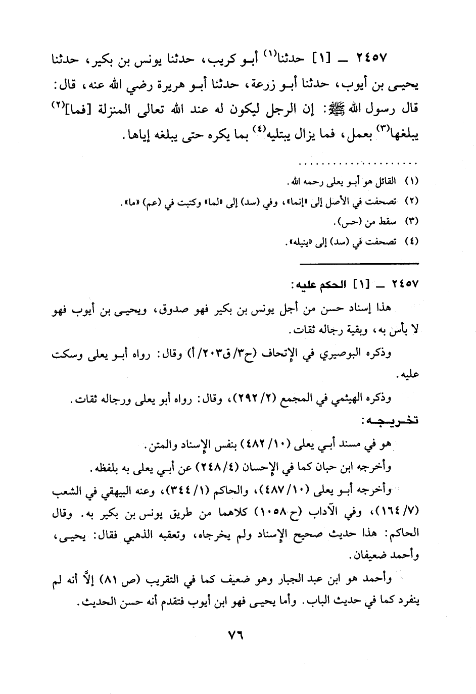 2457 -[1] حَدَّثَنَا أَبُو كُرَيْبٍ، حَدَّثَنَا يُونُسُ بْنُ بُكَيْرٍ، حَدَّثَنَا يَحْيَى بْنُ أَيُّوبَ، حَدَّثَنَا أَبُو زُرْعَةَ، حَدَّثَنَا أَبُو هُرَيْرَةَ رَضِيَ الله عَنْهُ، قَالَ: قَالَ رَسُولُ اللَّهِ صَلَّى اللَّهُ عَلَيْهِ وَسَلَّمَ: §إِنَّ الرَّجُلَ لَيَكُونُ لَهُ عِنْدَ اللَّهِ تَعَالَى الْمَنْزِلَةُ [فَمَا] يَبْلُغُهَا بِعَمَلٍ، فَمَا يَزَالُ يَبْتَلِيهِ بِمَا يَكْرَهُ حَتَّى يُبْلِغَهُ إِيَّاهَا -[78]-.