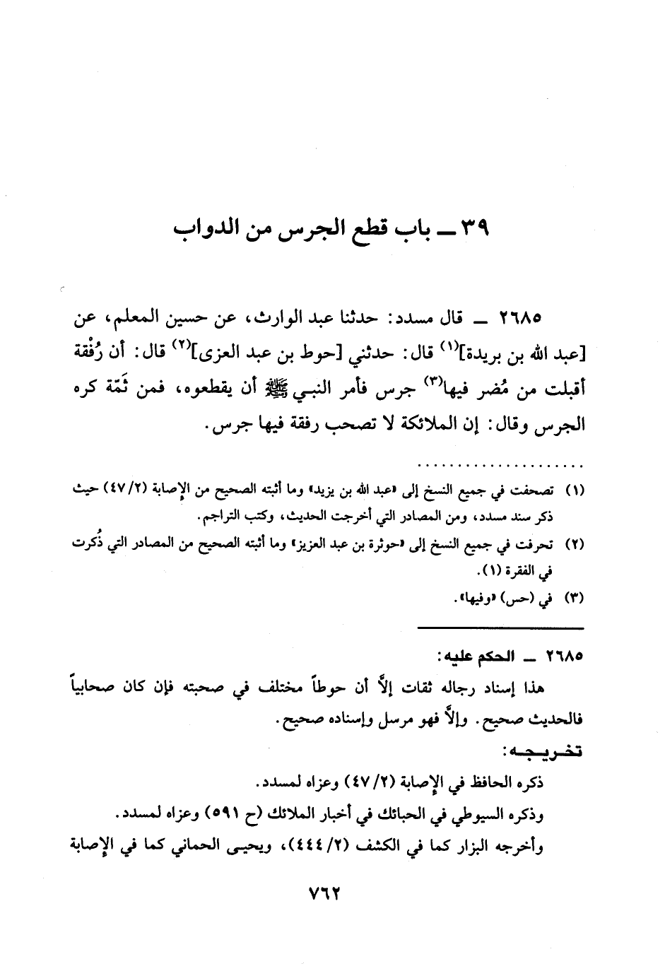2685 - قَالَ مُسَدَّدٌ: حَدَّثَنَا عَبْدُ الْوَارِثِ، عَنْ حُسَيْنٍ الْمُعَلِّمِ، عَنْ [عَبْدِ اللَّهِ بْنِ بُرَيْدَةَ] قَالَ: حَدَّثَنِي [حَوطُ بْنُ عَبْدِ الْعَزَّى] قَالَ: أَنَّ رُفْقَةً أَقْبَلَتْ مِنْ مُضَرَ فِيهَا جَرَسٌ فَأَمَرَ النَّبِيُّ صَلَّى اللَّهُ عَلَيْهِ وَسَلَّمَ أَنْ يَقْطَعُوهُ، فَمِنْ ثَمَّةَ كُرِهَ الْجَرَسُ وَقَالَ: إِنَّ §الْمَلَائِكَةَ لَا تَصْحَبُ رُفْقَةً فِيهَا جَرَسٌ.