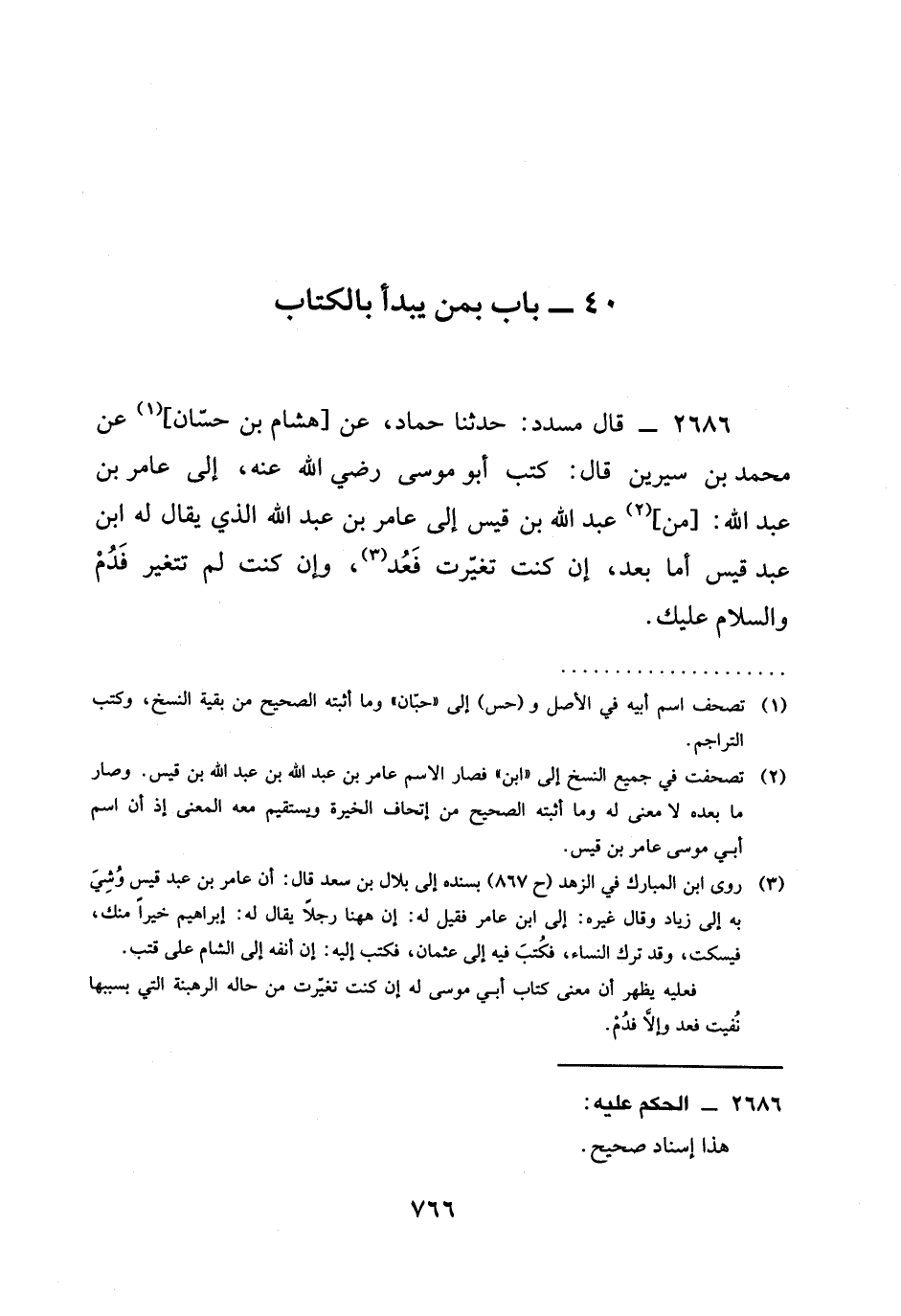 2686 - قَالَ مُسَدَّدٌ: حَدَّثَنَا حَمَّادٌ، عَنْ [هِشَامِ بْنِ حَسَّانَ] عَنْ مُحَمَّدِ بْنِ سِيرِينَ قَالَ: كَتَبَ أَبُو مُوسَى رَضِيَ الله عَنْهُ، إِلَى عَامِرِ بْنِ عَبْدِ اللَّهِ: [مِنْ] عَبْدِ اللَّهِ بْنِ قَيْسٍ إِلَى عَامِرِ بْنِ عَبْدِ اللَّهِ الَّذِي يُقَالُ لَهُ ابْنُ عَبْدِ قَيْسٍ أَمَّا بَعْدُ، §إِنْ كُنْتَ تَغَيَّرْتَ فَعُدْ، وَإِنْ كُنْتَ لَمْ تَتَغَيَّرْ فَدُمْ وَالسَّلَامُ عَلَيْكَ.
