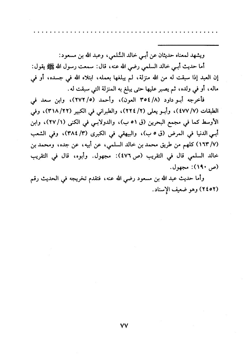 أما حديث أبي خالد السلمي رضي الله عنه، قال: سمعت رسول الله - صلى الله عليه وسلم- يقول: إن العبد إذا سبقت له من الله منزلة، لم يبلغها بعمله، ابتلاه الله في جسده، أو في ماله، أو في ولده، ثم يصبر عليها حتى يبلغ به المنزلة التي سبقت له.