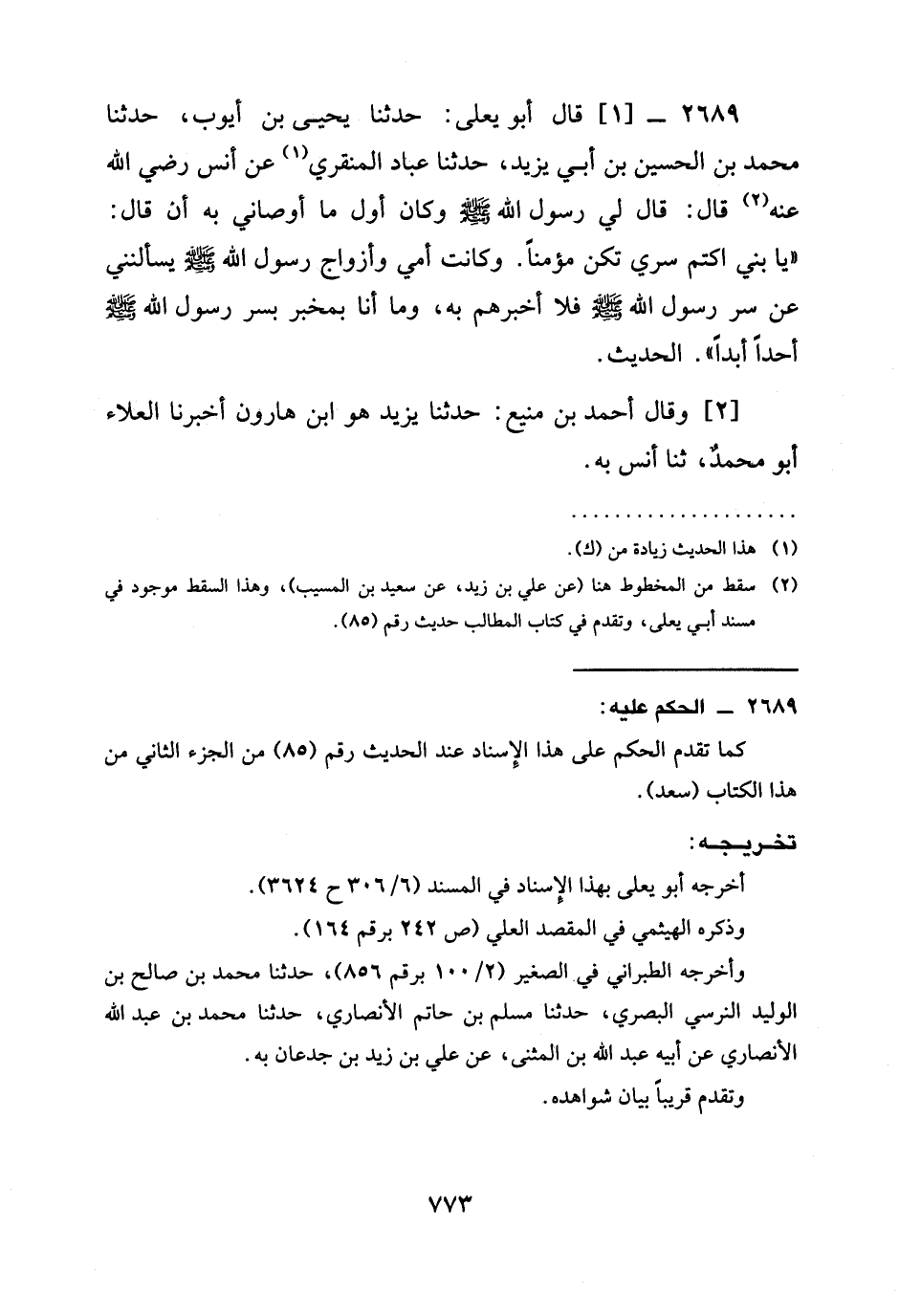 2689 -[1] قَالَ أَبُو يَعْلَى: حَدَّثَنَا يَحْيَى بْنُ أَيُّوبَ، حَدَّثَنَا مُحَمَّدُ بْنُ الْحُسَيْنِ بْنِ أَبِي يَزِيدَ، حَدَّثَنَا عَبَّادٌ الْمِنْقَرِيُّ عَنْ أَنَسٍ رَضِيَ الله عَنْهُ قَالَ: قَالَ لِي رَسُولُ اللَّهِ صَلَّى اللَّهُ عَلَيْهِ وَسَلَّمَ وَكَانَ أَوَّلَ مَا أَوْصَانِي بِهِ أَنْ قَالَ: " يَا بُنَيَّ §اكْتُمْ سِرِّي تَكُنْ مُؤْمِنًا. وَكَانَتْ أُمِّي وَأَزْوَاجُ رَسُولِ اللَّهِ صَلَّى اللَّهُ عَلَيْهِ وَسَلَّمَ يَسْأَلْنَنِي عَنْ سِرِّ رَسُولِ اللَّهِ صَلَّى اللَّهُ عَلَيْهِ وَسَلَّمَ فَلَا أُخْبِرُهُمْ بِهِ، وَمَا أَنَا بِمُخْبِرٍ بِسِرِّ رَسُولِ اللَّهِ صَلَّى اللَّهُ عَلَيْهِ وَسَلَّمَ أَحَدًا أَبَدًا ". الْحَدِيثَ.