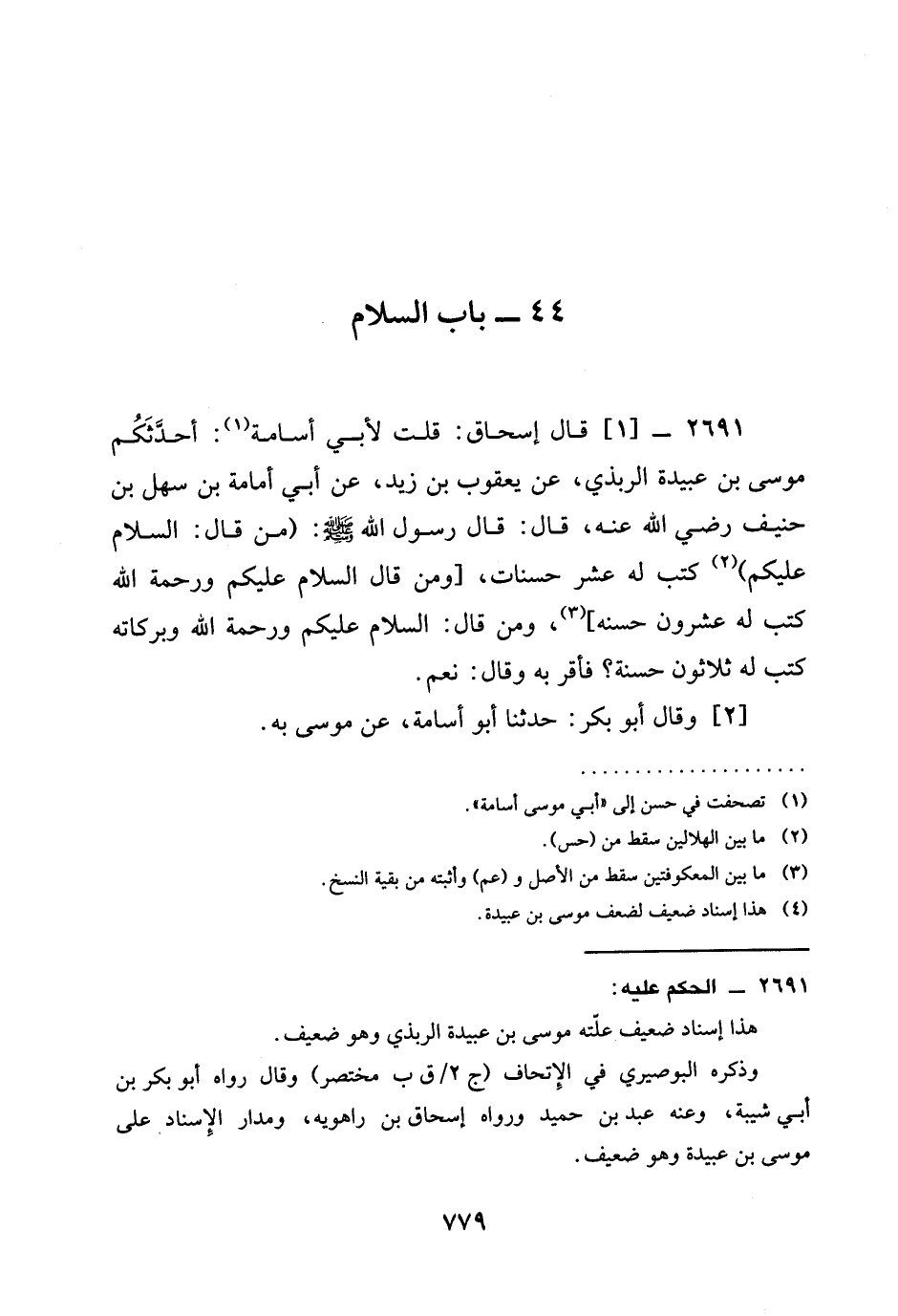 2691 -[1] قَالَ إِسْحَاقُ: قُلْتُ لِأَبِي أُسَامَةَ: أَحَدَّثَكُمْ مُوسَى بْنُ عُبَيْدَةَ الرَّبَذِيُّ، عَنْ يَعْقُوبَ بْنِ زَيْدٍ، عَنْ أَبِي أُمَامَةَ بْنِ سَهْلِ بْنِ حُنَيْفٍ رَضِيَ الله عَنْهُ، قَالَ: قَالَ رَسُولُ اللَّهِ صَلَّى اللَّهُ عَلَيْهِ وَسَلَّمَ: (§مَنْ قَالَ: السَّلَامُ عَلَيْكُمْ) كُتِبَ لَهُ عَشْرُ حَسَنَاتٍ، [وَمَنْ قَالَ السَّلَامُ عَلَيْكُمْ وَرَحْمَةُ اللَّهِ كُتِبَ لَهُ عِشْرُونَ حَسَنَةً] ، وَمَنْ قَالَ: السَّلَامُ عَلَيْكُمْ وَرَحْمَةُ اللَّهِ وَبَرَكَاتُهُ كُتِبَ لَهُ ثَلَاثُونَ حَسَنَةً؟ فَأَقَرَّ بِهِ وَقَالَ: نَعَمْ.