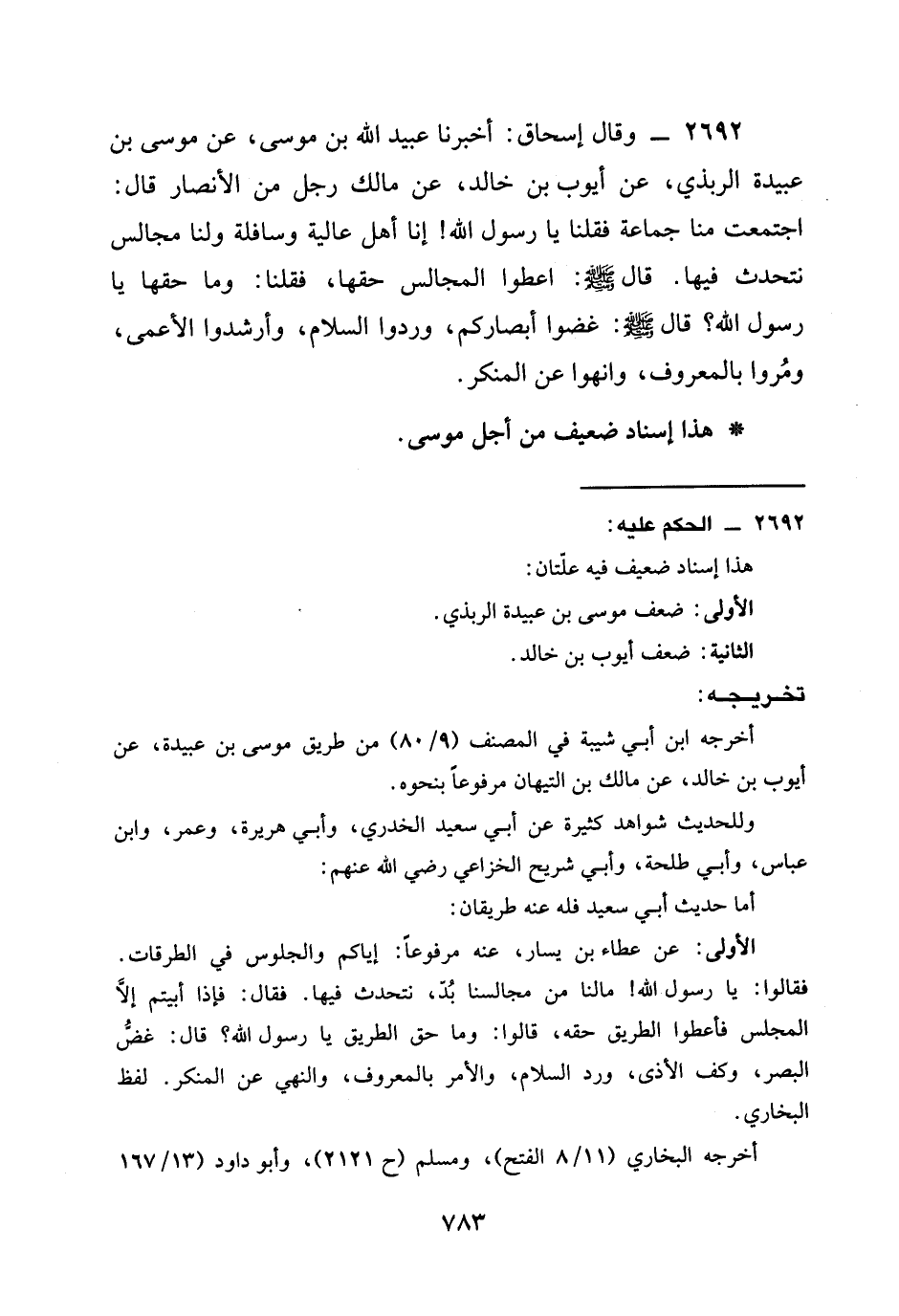 2692 - وَقَالَ إِسْحَاقُ: أَخْبَرَنَا عُبَيْدُ اللَّهِ بْنُ مُوسَى، عَنْ مُوسَى بْنِ عُبَيْدَةَ الرَّبَذِيِّ، عَنْ أَيُّوبَ بْنِ خَالِدٍ، عَنْ مَالِكٍ رَجُلٍ مِنَ الْأَنْصَارِ قَالَ: اجْتَمَعَتْ مِنَّا جَمَاعَةٌ فَقُلْنَا يَا رَسُولَ اللَّهِ! إِنَّا أَهْلُ عَالِيَةٍ وَسَافِلَةٍ وَلَنَا مَجَالِسُ نَتَحَدَّثُ فِيهَا. قَالَ صَلَّى اللَّهُ عَلَيْهِ وَسَلَّمَ: §أَعْطُوا الْمَجَالِسَ حَقَّهَا، فَقُلْنَا: وَمَا حَقُّهَا يَا رَسُولَ اللَّهِ؟ قَالَ صَلَّى اللَّهُ عَلَيْهِ وَسَلَّمَ: غَضُّوا أَبْصَارَكُمْ، وَرُدُّوا السَّلَامَ، وَأرْشُدُوا الْأَعْمَى، وَمُرُوا بِالْمَعْرُوفِ، وَانْهَوْا عَنِ الْمُنْكَرِ.