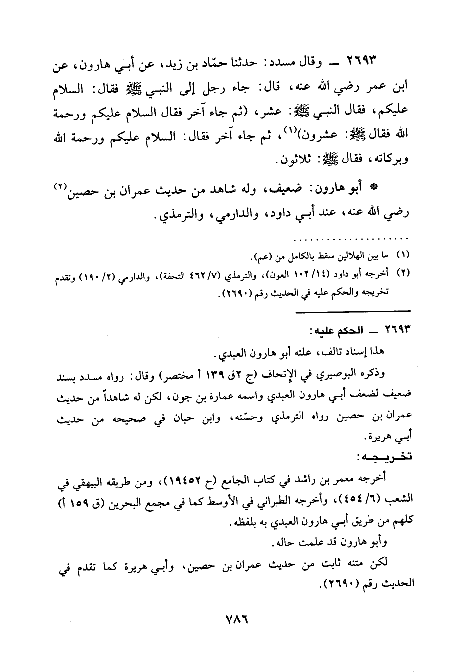 2693 - وَقَالَ مُسَدَّدٌ: حَدَّثَنَا حَمَّادُ بْنُ زَيْدٍ، عَنْ أَبِي هَارُونَ، عَنِ ابْنِ عُمَرَ رَضِيَ الله عَنْهُ، قَالَ: §جَاءَ رَجُلٌ إِلَى النَّبِيِّ صَلَّى اللَّهُ عَلَيْهِ وَسَلَّمَ فَقَالَ: السَّلَامُ عَلَيْكُمْ، فَقَالَ النَّبِيُّ صَلَّى اللَّهُ عَلَيْهِ وَسَلَّمَ: عَشْرٌ، (ثُمَّ جَاءَ آخَرُ فَقَالَ السَّلَامُ عَلَيْكُمْ وَرَحْمَةُ اللَّهِ فَقَالَ صَلَّى اللَّهُ عَلَيْهِ وَسَلَّمَ: عِشْرُونَ) ، ثُمَّ جَاءَ آخَرُ فَقَالَ: السَّلَامُ عَلَيْكُمْ وَرَحْمَةُ اللَّهِ وَبَرَكَاتُهُ، فَقَالَ صَلَّى اللَّهُ عَلَيْهِ وَسَلَّمَ: ثَلَاثُونَ.