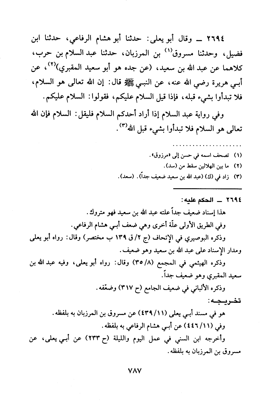 2694 - وَقَالَ أَبُو يَعْلَى: حَدَّثَنَا أَبُو هِشَامٍ الرِّفَاعِيُّ، حَدَّثَنَا ابْنُ فُضَيْلٍ، وَحَدَّثَنَا مَسْرُوقُ بْنُ الْمَرْزُبَانِ، حَدَّثَنَا عَبْدُ السَّلَامِ بْنُ حَرْبٍ، كِلَاهُمَا عَنْ عَبْدِ اللَّهِ بْنِ سَعِيدٍ، (عَنْ جَدِّهِ هُوَ أَبُو سَعِيدٍ الْمَقْبُرِيُّ) ، عَنْ أَبِي هُرَيْرَةَ رَضِيَ الله عَنْهُ، عَنِ النَّبِيِّ صَلَّى اللَّهُ عَلَيْهِ وَسَلَّمَ قَالَ: إِنَّ §اللَّهَ تَعَالَى هُوَ السَّلَامُ، فَلَا تبدأوا بِشَيْءٍ قَبْلَهُ، فَإِذَا قِيلَ السَّلَامُ عَلَيْكُمْ، فَقُولُوا: السَّلَامُ عَلَيْكُمْ.