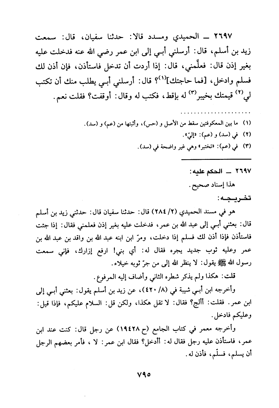 2697 - الْحُمَيْدِيُّ وَمُسَدَّدٌ قَالَا: حَدَّثَنَا سُفْيَانُ، قَالَ: سَمِعْتُ زَيْدَ بْنَ أَسْلَمَ، قَالَ: أَرْسَلَنِي أَبِي إِلَى ابْنُ عُمَرَ رَضِيَ الله عَنْهُ فَدَخَلْتُ عَلَيْهِ بِغَيْرِ إِذَنٍ قَالَ: فَعَلَّمَنِي، قَالَ: §إِذَا أَرَدْتَ أَنْ تَدْخُلَ فَاسْتَأْذِنْ، فَإِنْ أُذِنَ لَكَ فَسَلِّمْ وَادْخُلْ، [فَمَا حَاجَتُكَ] ؟ قَالَ: أَرْسَلَنِي أَبِي يَطْلُبُ مِنْكَ أَنْ تَكْتُبَ لِي قِيمَتَكَ بِخَيْبَرَ لَهُ بِإِقِطٍ، فَكَتَبَ لَهُ وَقَالَ: أَوقَفْتَ؟ فَقُلْتُ نَعَمْ.