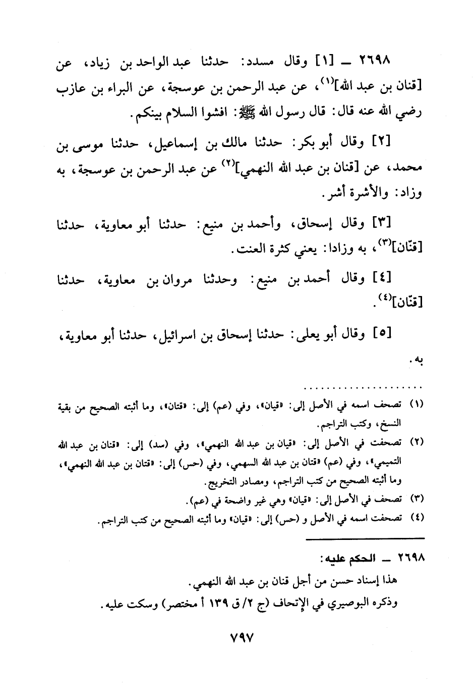 2698 -[1] وَقَالَ مُسَدَّدٌ: حَدَّثَنَا عَبْدُ الْوَاحِدِ بْنُ زِيَادٍ، عَنْ [قَنَانِ بْنِ عَبْدِ اللَّهِ] ، عَنْ عَبْدِ الرَّحْمَنِ بْنِ عَوْسَجَةَ، عَنِ الْبَرَاءِ بْنِ عَازِبٍ رَضِيَ الله عَنْهُ قَالَ: قَالَ رَسُولُ اللَّهِ صَلَّى اللَّهُ عَلَيْهِ وَسَلَّمَ: §أَفْشُوا السَّلَامَ بَيْنَكُمْ.