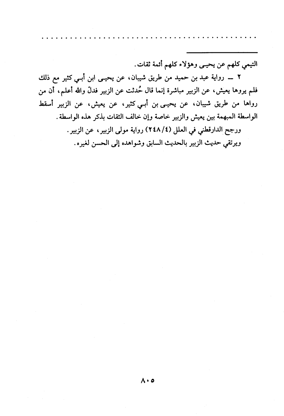 2 - رواية عبد بن حميد من طريق شيبان، عن يحيى ابن أبي كثير مع ذلك فلم يروها يعيش، عن الزبير مباشرة إنما قال حُدثت عن الزبير فدلّ والله أعلم، أن من رواها من طريق شَيْبَانُ، عَنْ يَحْيَى بْنِ أَبِي كَثِيرٍ، عَنْ يعيش، عن الزبير أسقط الواسطة المبهمة بين يعيش والزبير خاصة هان خالف الثقات بذكر هذه الواسطة.
