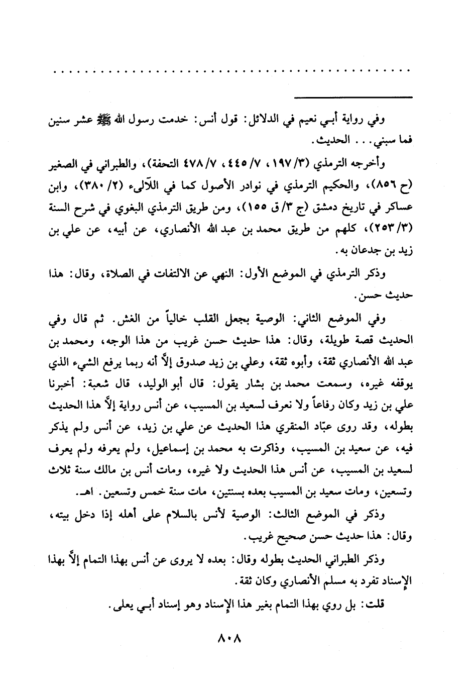 وفي الموضع الثاني: الوصية بجعل القلب خاليًا من الغش. ثم قال وفي الحديث قصة طويلة، وقال: هذا حديث حسن غريب من هذا الوجه، ومحمد بن عبد الله الأنصاري ثقة، وأبوه ثقة، وعلي بن زيد صدوق إلَّا أنه ربما يرفع الشيء الذي يوقفه غيره، وسمعت محمد بن بشار يقول: قال أبو الوليد، قال شعبة: أخبرنا علي بن زيد وكان رفاعًا ولا نعرف لسعيد بن المسيب، عن أنس رواية إلَّا هذا الحديث بطوله، وقد روى عبّاد المنقري هذ االحديث عَنْ عَلِيِّ بْنِ زَيْدٍ، عَنْ أَنَسٍ وَلَمْ يذكر فيه، عن سعيد بن المسيب، وذكرت به محمد بن إسماعيل، ولم يعوفه ولم يعرف لسعيد بن المسيب، عن أنس هذا الحديث ولا غيره، ومات أنس بن مالك سنة ثلاث وتسعين، ومات سعيد بن المسيب بعده بسنتين، مات سنة خمس وتسعين. اهـ.