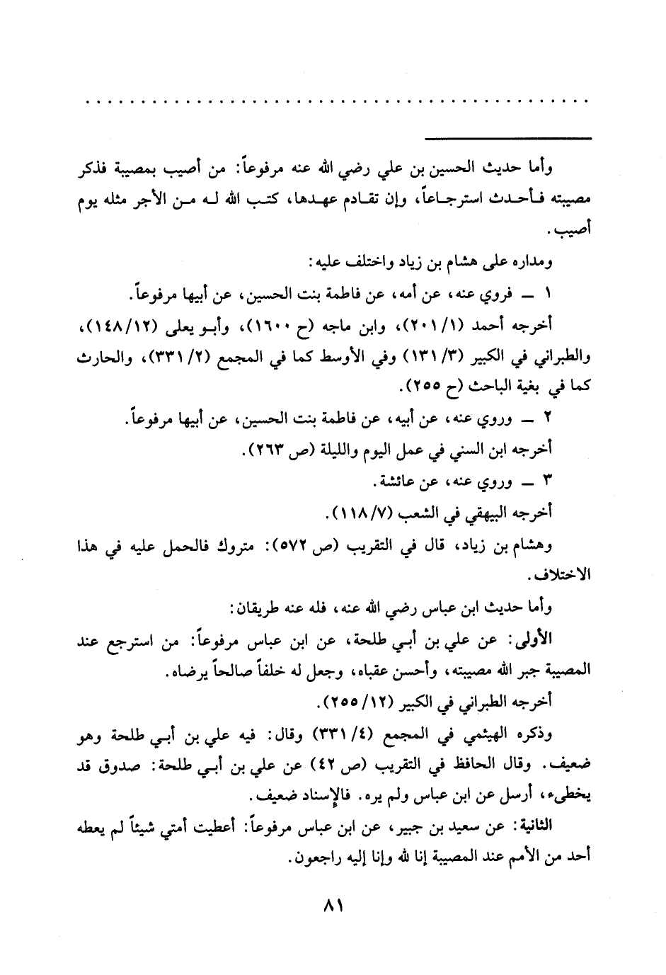 الأولى: عَنْ عَلِيِّ بْنِ أَبِي طَلْحَةَ، عَنِ ابْنِ عباس مرفوعًا: من استرجع عند المصيبة جبر الله مصيبته، وأحسن عقباه، وجعل له خلفًا صالحًا يرضاه.