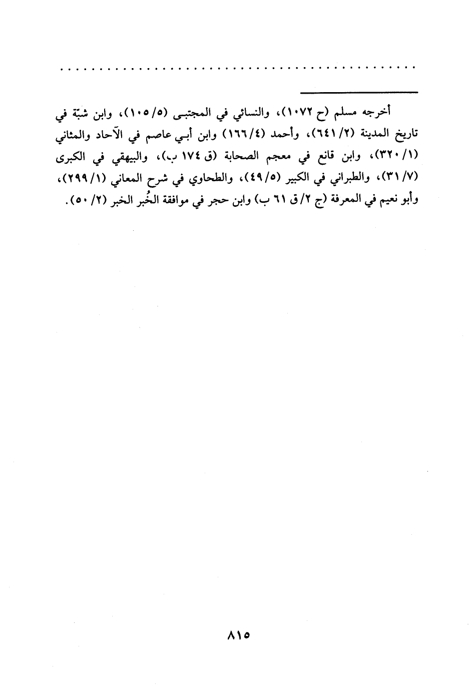 = أخرجه مسلم (ح 1072)، والنسائي في المجتبى (5/ 105)، وابن شبّة في تاريخ المدينة (2/ 641)، وأحمد (4/ 166) وابن أبي عاصم في الآحاد والمثاني (1/ 320)، وابن قانع في معجم الصحابة (ق 174 ب،)، والبيهقي في الكبرى (7/ 31)، والطبراني في الكبير (5/ 49)، والطحاوي في شرح المعاني (1/ 299)، وأبو نعيم في المعرفة (ج 2/ ق 61 ب) وابن حجر في موافقة الخُبر الخبر (2/ 50).