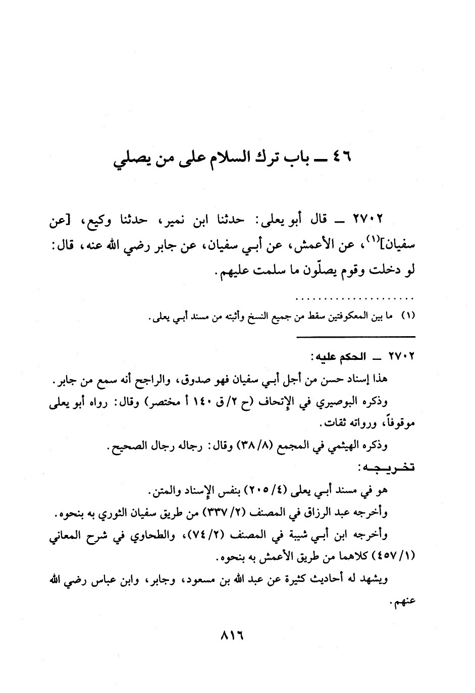 2702 - قَالَ أَبُو يَعْلَى: حَدَّثَنَا ابْنُ نُمَيْرٍ، حَدَّثَنَا وَكِيعٌ، [عَنْ سُفْيَانَ] ، عَنِ الْأَعْمَشِ، عَنْ أَبِي سُفْيَانَ، عَنْ جَابِرٍ رَضِيَ الله عَنْهُ، قَالَ: §لَوْ دَخَلْتُ وَقَوْمٌ يُصَلُّونَ مَا سَلَّمْتُ عَلَيْهِمْ.