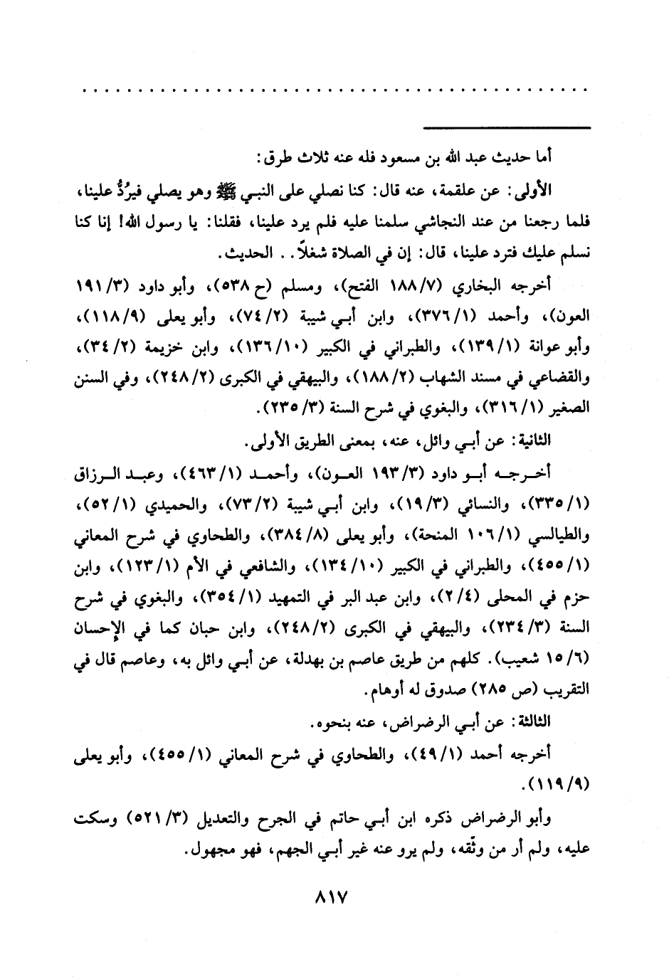 الأولى: عن علقمة، عنه قال: كنا نصلي عَلَى النَّبِيِّ -صَلَّى اللَّهُ عَلَيْهِ وَسَلَّمَ- وَهُوَ يصلي فيرُدُّ علينا، فلما رجعنا من عند النجاشي سلمنا عليه فلم يرد علينا، فقلنا: يا رسول الله! إنا كنا نسلم عليك فترد علينا، قال: إن في الصلاة شغلًا .. الحديث.
