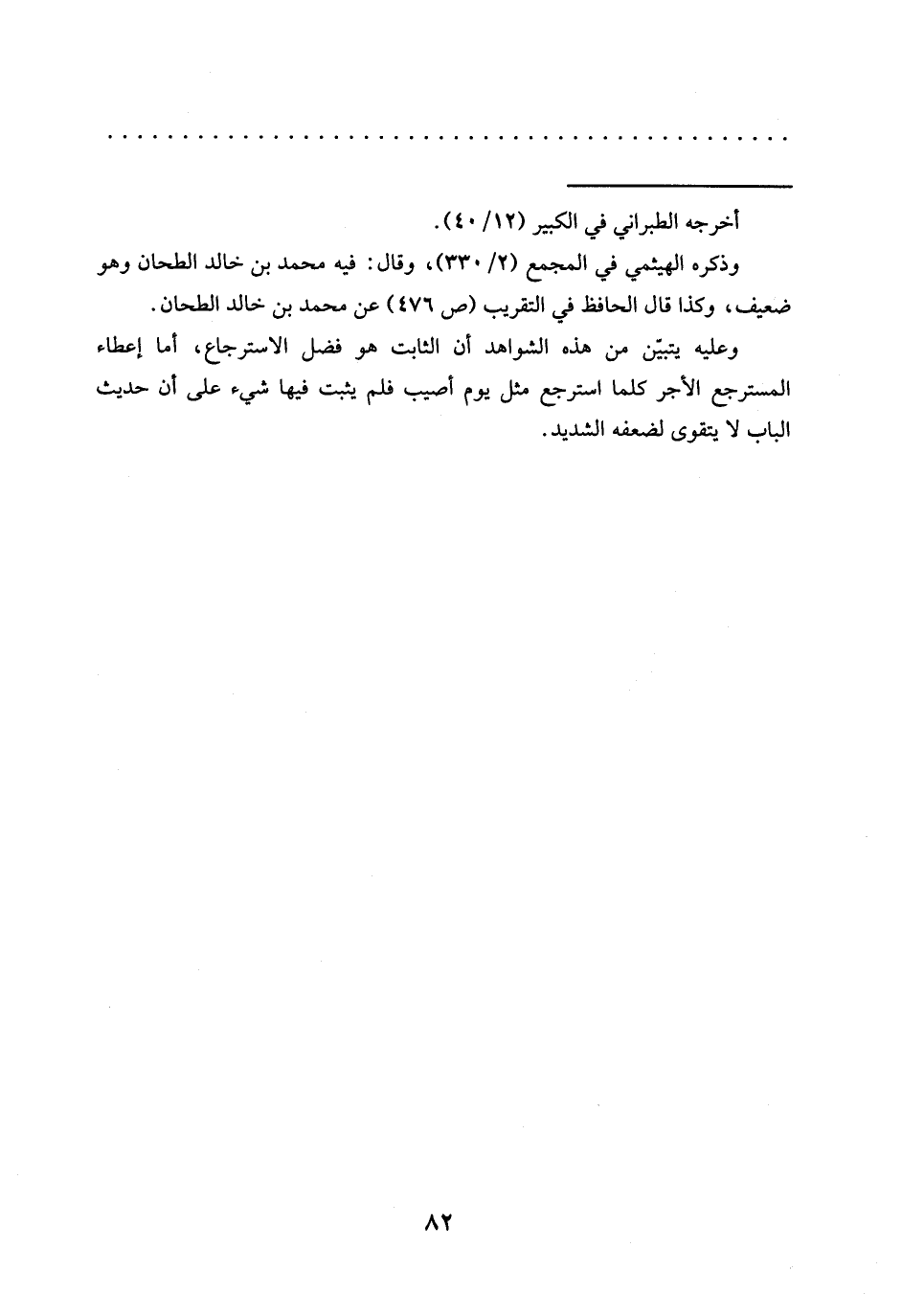 وعليه يتبيّن من هذه الشواهد أن الثابت هو فضل الاسترجاع، أما إعطاء المسترجع الأجر كلما استرجع مثل يوم أصيب فلم يثبت فيها شيء على أن حديث الباب لا يتقوى لضعفه الشديد.