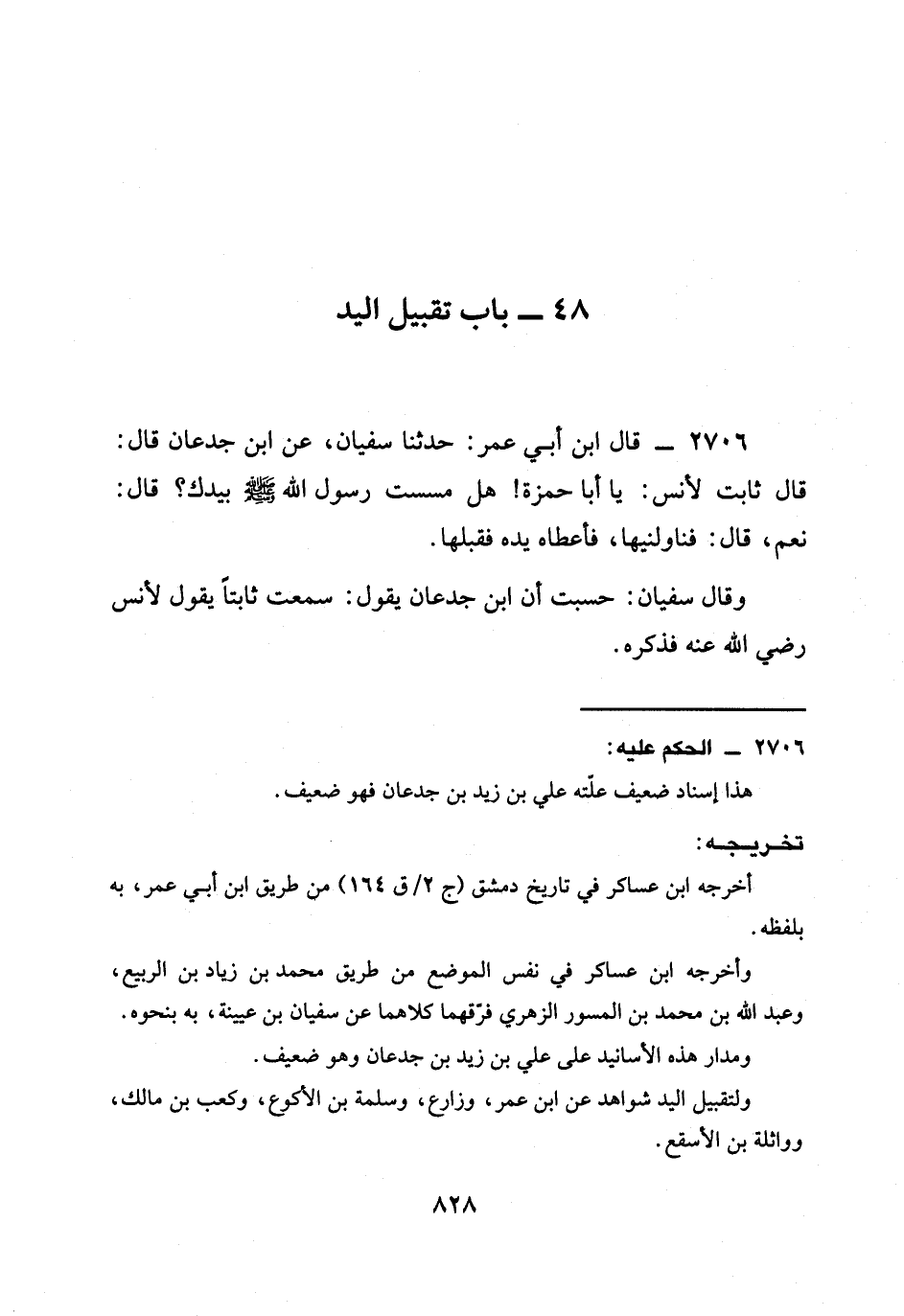 2706 - قَالَ ابْنُ أَبِي عُمَرَ: حَدَّثَنَا سُفْيَانُ، عَنِ ابْنِ جُدْعَانَ قَالَ: قَالَ ثَابِتٌ لِأَنَسٍ: يَا أَبَا حَمْزَةَ! §هَلْ مَسَسْتَ رَسُولَ اللَّهِ صَلَّى اللَّهُ عَلَيْهِ وَسَلَّمَ بِيَدِكَ؟ قَالَ: نَعَمْ، قَالَ: فَنَاوِلْنِيهَا، فَأَعْطَاهُ يَدَهُ فَقَبَّلَهَا.