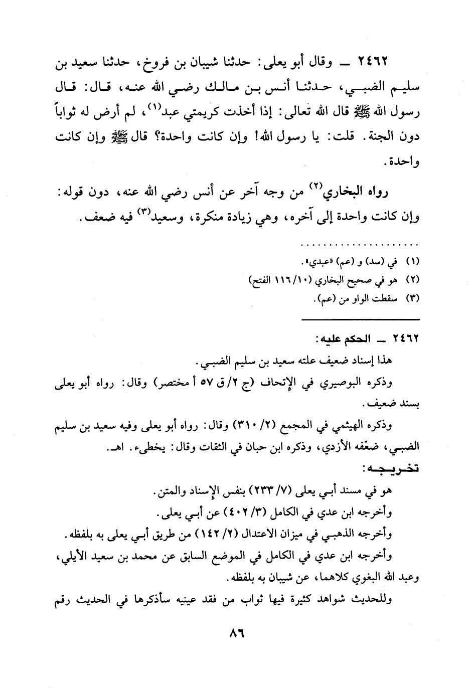 2462 - وَقَالَ أَبُو يَعْلَى: حَدَّثَنَا شَيْبَانُ بْنُ فَرُّوخَ، حَدَّثَنَا سَعِيدُ بْنُ سُلَيْمٍ الضَّبِّيُّ، حَدَّثَنَا أَنَسُ بْنُ مَالِكٍ رَضِيَ الله عَنْهُ، قَالَ: قَالَ رَسُولُ اللَّهِ صَلَّى اللَّهُ عَلَيْهِ وَسَلَّمَ قَالَ اللَّهُ تَعَالَى: §إِذَا أَخَذْتُ كَرِيمَتَيْ عَبْدٍ، لَمْ أَرْضَ لَهُ ثَوَابًا دُونَ الْجَنَّةِ. قُلْتُ: يَا رَسُولَ اللَّهِ! وَإِنْ كَانَتْ وَاحِدَةً؟ قَالَ صَلَّى اللَّهُ عَلَيْهِ وَسَلَّمَ وَإِنْ كَانَتْ وَاحِدَةً. رواه الْبُخَارِيُّ مِنْ وَجْهٍ آخَّرَ عَنْ أَنَسٍ رَضِيَ الله عَنْهُ، دُونَ قَوْلِهِ: وَإِنْ كَانَتْ وَاحِدَةً إِلَى آخِرِهِ، وَهِيَ زِيَادَةٌ مُنْكَرَةٌ، وَسَعِيدٌ فِيهِ ضَعْفٌ.