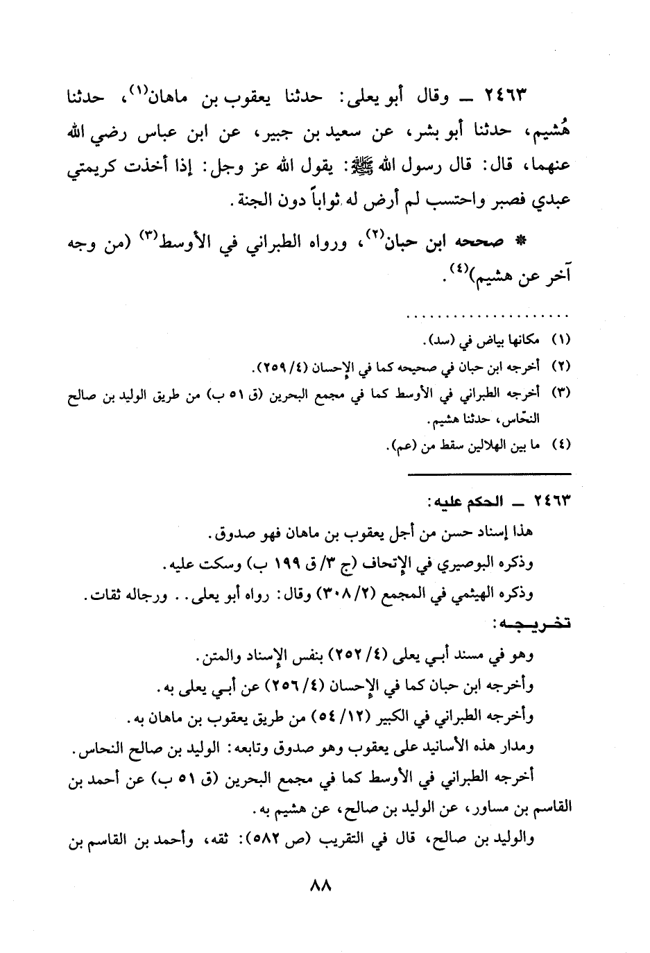 2463 - وَقَالَ أَبُو يَعْلَى: حَدَّثَنَا يَعْقُوبُ بْنُ مَاهَانَ، حَدَّثَنَا هُشَيْمٌ، حَدَّثَنَا أَبُو بِشْرٍ، عَنْ سَعِيدِ بْنِ جُبَيْرٍ، عَنِ ابْنِ عَبَّاسٍ رَضِيَ الله عَنْهُمَا، قَالَ: قَالَ رَسُولُ اللَّهِ صَلَّى اللَّهُ عَلَيْهِ وَسَلَّمَ: يَقُولُ اللَّهُ عَزَّ وَجَلَّ: §إِذَا أَخَذْتُ كَرِيمَتَيْ عَبْدِي فَصَبَرَ وَاحْتَسَبَ لَمْ أَرْضَ لَهُ ثَوَابًا دُونَ الْجَنَّةِ.