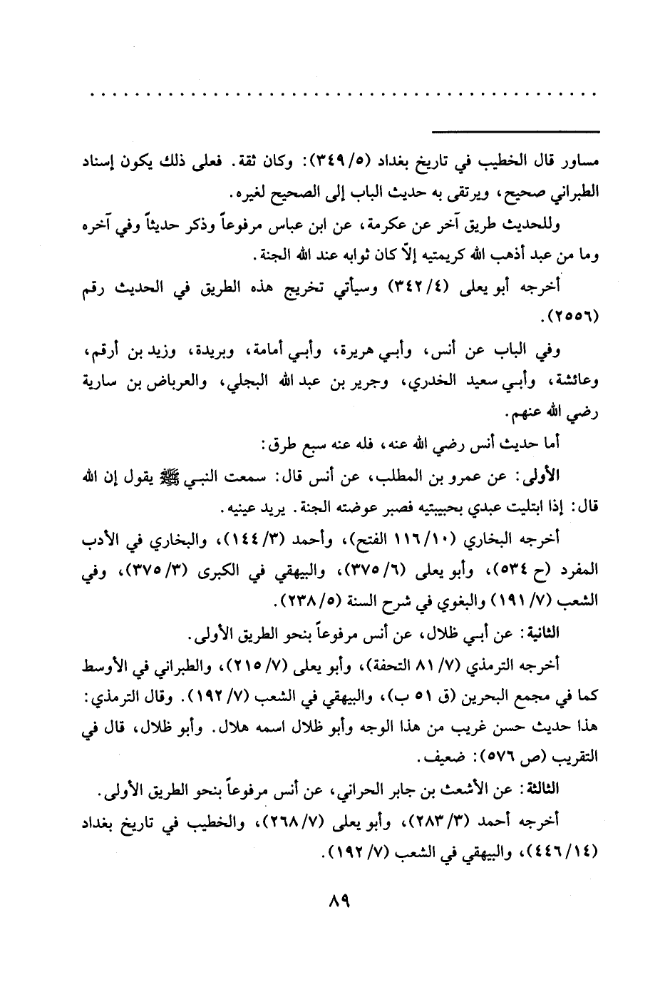 أما حديث أنس رضي الله عنه، فله عنه سبع طرق: الأولى: عن عمرو بن المطلب، عن أنس قَالَ: سَمِعْتُ النَّبِيَّ -صَلَّى اللَّهُ عَلَيْهِ وَسَلَّمَ - يقول إن الله قال: إذا ابتليت عبدي بحبيبتيه فصبر عوضته الجنة. يريد عينيه.
