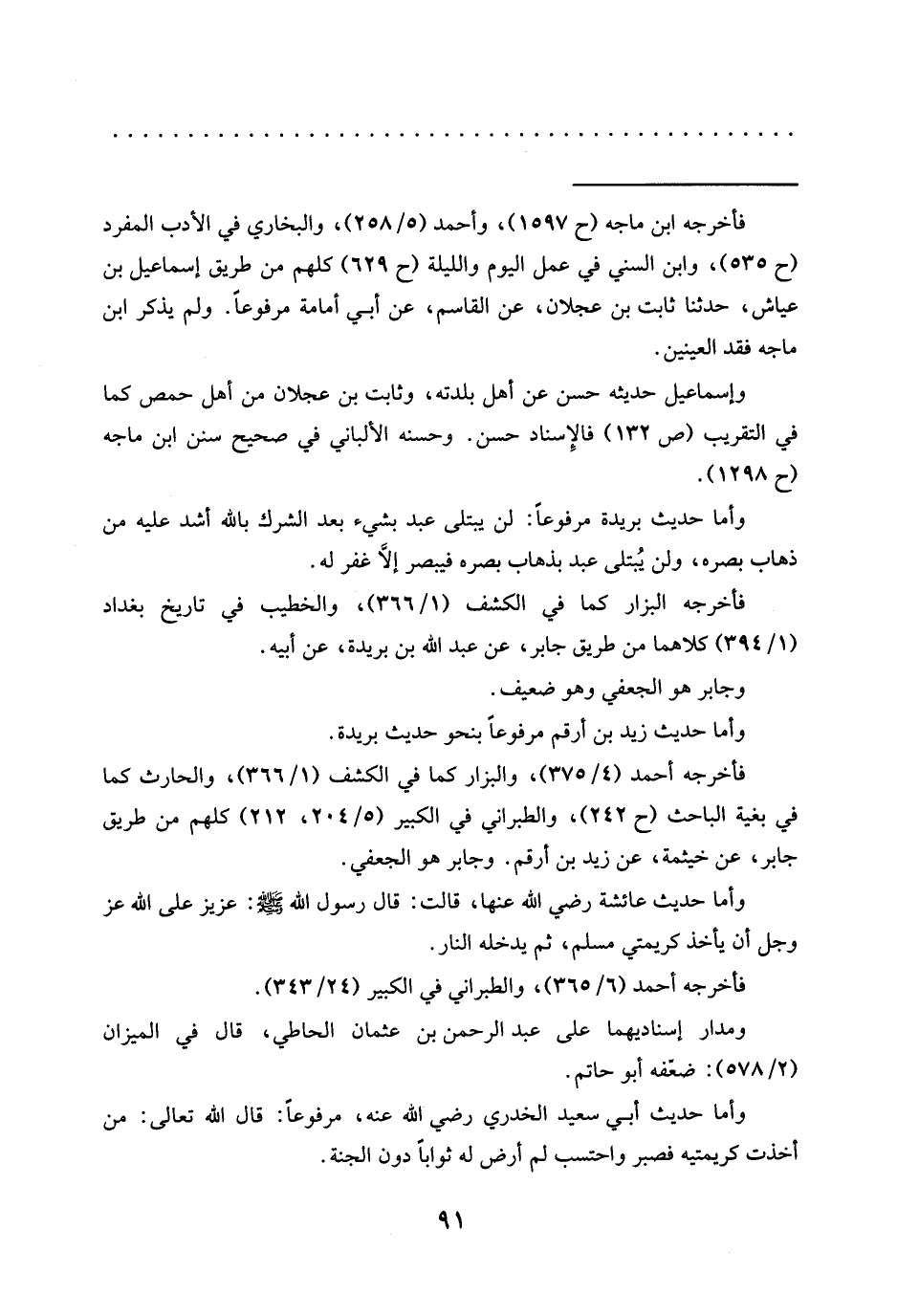 = فأخرجه ابن ماجه (ح 1597)، وأحمد (5/ 258)، والبخاري في الأدب المفرد (ح 535)، وابن السني في عمل اليوم والليلة (ح 629) كلهم من طريق إسماعيل بن عياش، حدّثنا ثابت بن عجلان، عن القاسم، عن أبي أمامة مرفوعًا. ولم يذكر ابن ماجه فقد العينين.