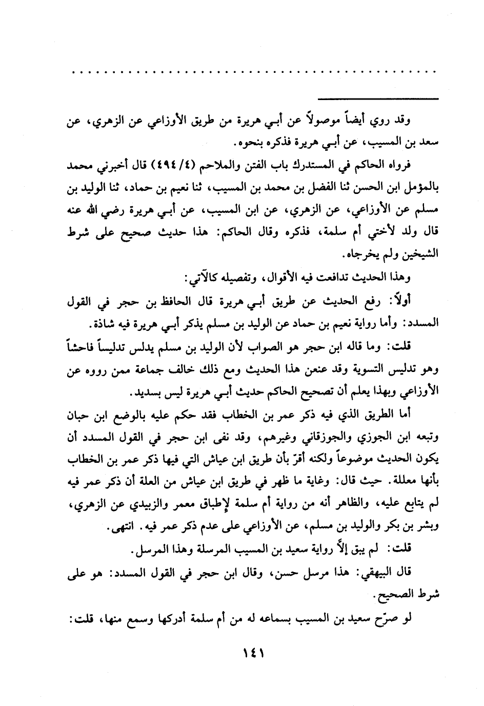 قلت: وما قاله ابن حجر هو الصواب لأنّ الوليد بن مسلم يدلس تدليسًا فاحشًا وهو تدليس التسوية وقد عنعن هذا الحديث ومع ذلك خالف جماعة ممن رووه عن الأوزاعي وبهذا يعلم أن تصحيح الحاكم حديث أبي هريرة ليس بسديد.