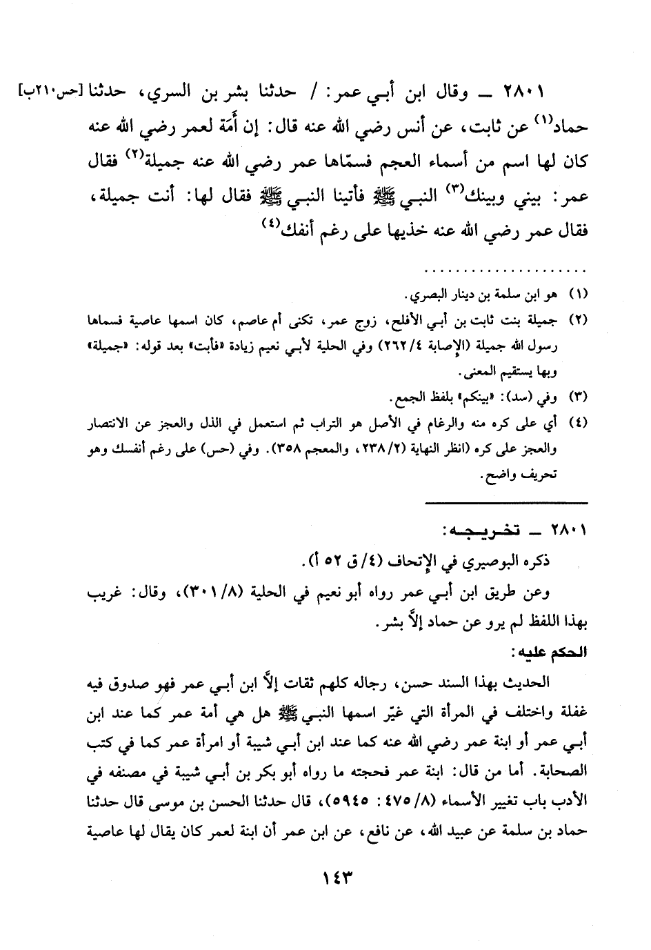 2801 - وقَالَ ابْن أَبِي عُمَرَ: / حَدَّثَنَا بِشْرُ بْنُ السَّرِيِّ، حدثنا حماد عن ثابت، عن أنس رَضِيَ الله عَنْه قال: أَنَّ أَمَةً لِعُمَرَ رَضِيَ الله عَنْه كَانَ لَهَا اسْمٌ مِنْ أَسْمَاءِ الْعَجَمِ فَسَمَّاهَا عُمَرُ رَضِيَ الله عَنْه جَمِيلَةَ فَقَالَ عُمَرُ: §بَيْنِي وبينك النبي صَلَّى اللَّهُ عَلَيْهِ وَسَلَّمَ فأتينا النَّبِيَّ صَلَّى اللَّهُ عَلَيْهِ وَسَلَّمَ فَقَالَ لَهَا: أَنْتِ جَمِيلَةُ فَقَالَ عُمَرُ رَضِيَ الله عَنْه خُذِيهَا عَلَى رَغْمِ أَنْفِكِ.