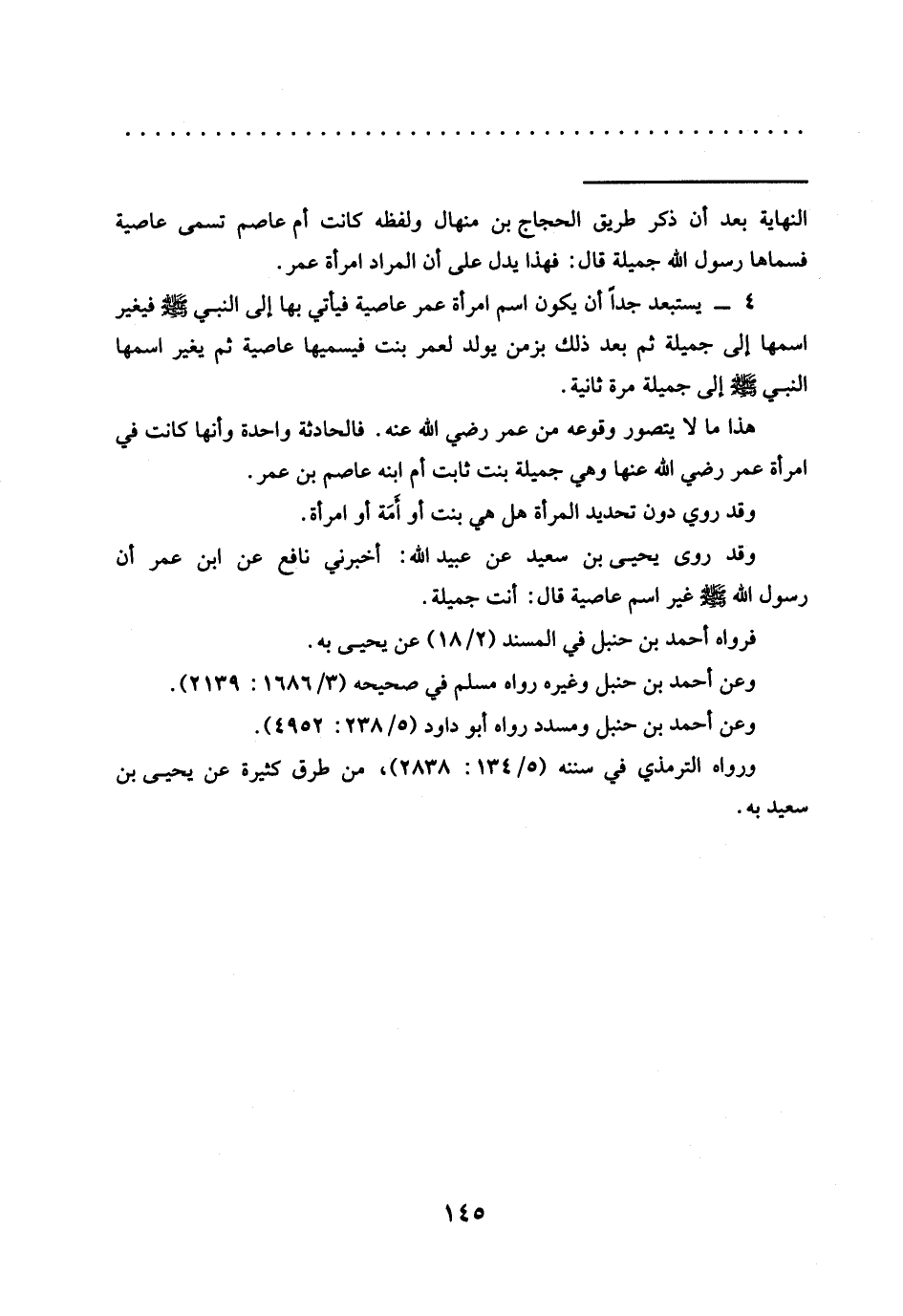 4 - يستبعد جدًا أن يكون اسم امرأة عمر عاصية فيأتي بها إلى النبي -صلى الله عليه وسلم- فيغير اسمها إلى جميلة ثم بعد ذلك بزمن يولد لعمر بنت فيسميها عاصية ثم يغير اسمها النبي -صلى الله عليه وسلم- إلى جميلة مرة ثانية.