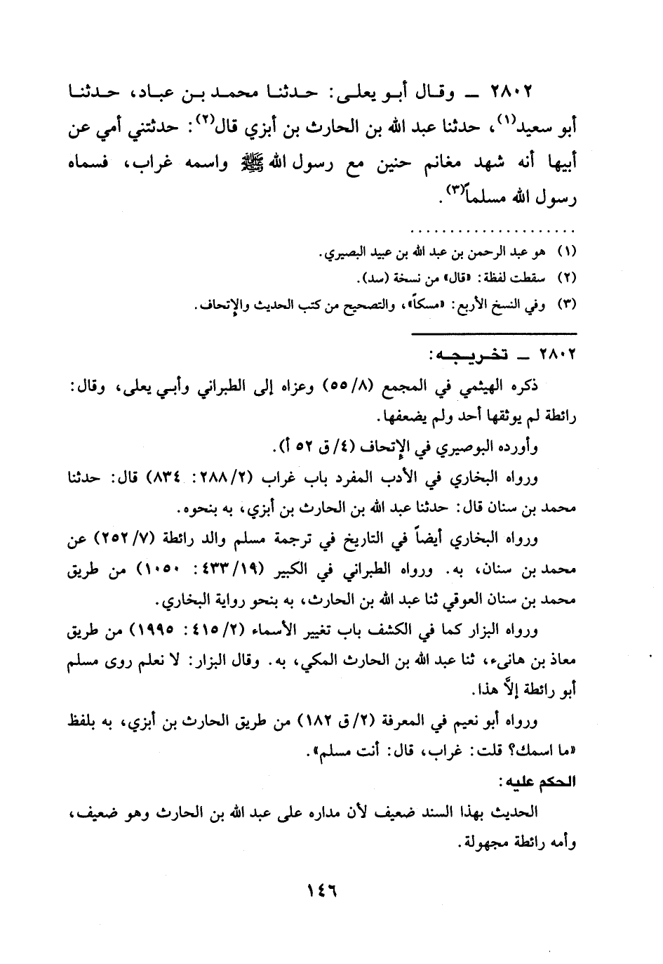 2802 - وقال أَبُو يَعْلَى: حَدَّثَنَا مُحَمَّدُ بْنُ عَبَّادٍ، حدثنا أَبُو سَعِيدٍ، حدثنا عَبْدُ اللَّهِ بْنُ الْحَارِثِ بن أبزي قال: حَدَّثَتْنِي أُمِّي عَنْ أَبِيهَا أَنَّهُ §شَهِدَ مَغَانِمَ حُنَيْنٍ مَعَ رَسُولِ اللَّهِ صَلَّى اللَّهُ عَلَيْهِ وَسَلَّمَ وَاسْمُهُ غُرَابٌ، فَسَمَّاهُ رَسُولُ اللَّهِ مُسْلِمًا.