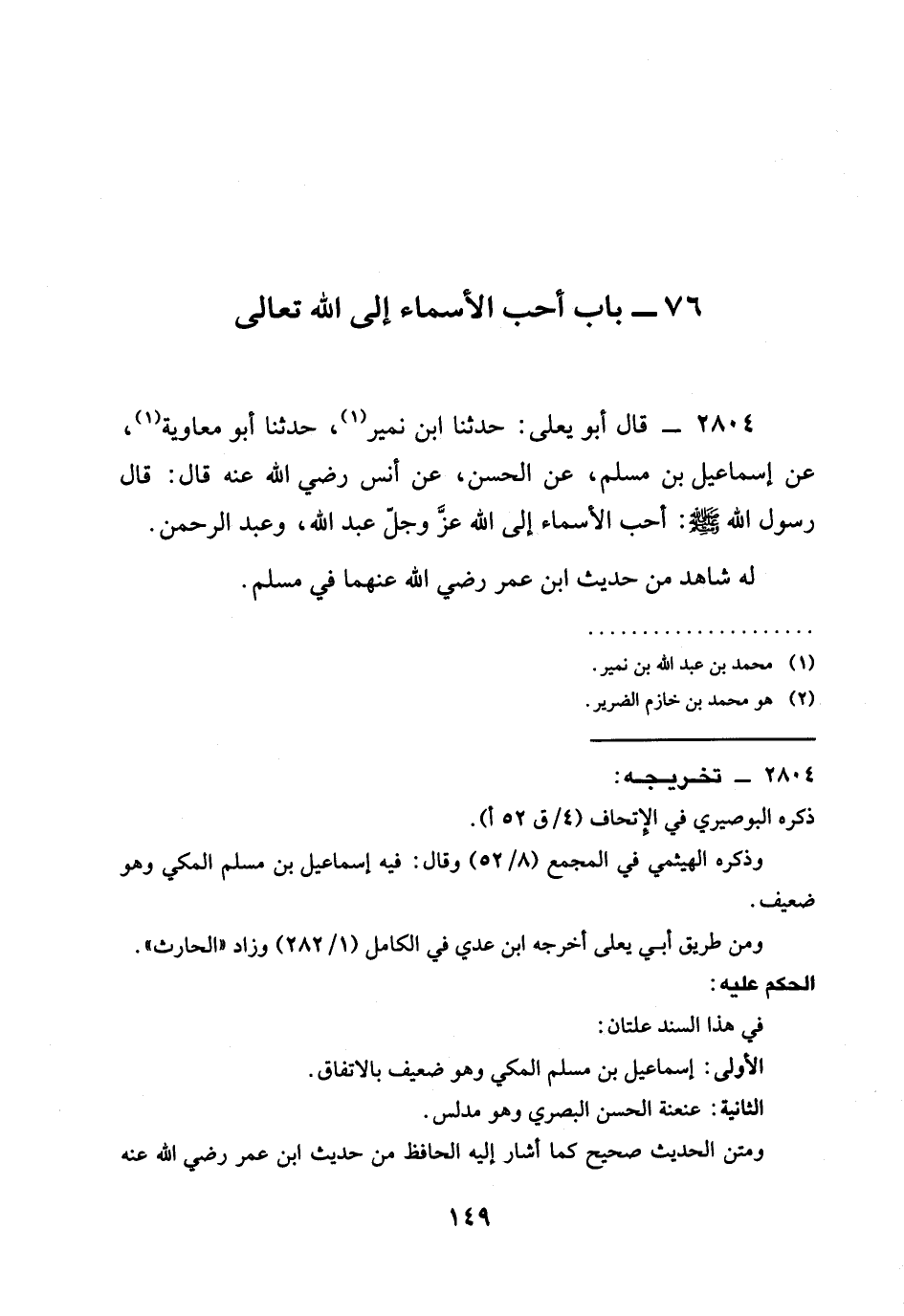 2804 - قَالَ أَبُو يَعْلَى: حَدَّثَنَا ابْنُ نُمَيْرٍ، حدثنا أَبُو مُعَاوِيَةَ، عَنْ إِسْمَاعِيلَ بْنِ مُسْلِمٍ، عَنِ الْحَسَنِ، عَنْ أَنَسٍ رَضِيَ الله عَنْه قَالَ: قَالَ رَسُولُ اللَّهِ صَلَّى اللَّهُ عَلَيْهِ وَسَلَّمَ: §أَحَبُّ الْأَسْمَاءِ إِلَى اللَّهِ عَزَّ وَجَلَّ عَبْدُ اللَّهِ، وَعَبْدُ الرَّحْمَنِ.