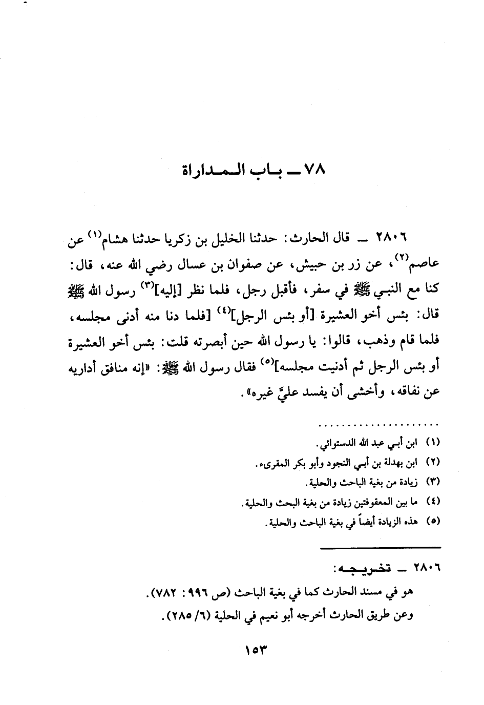 2806 - قَالَ الْحَارِثُ: حَدَّثَنَا الْخَلِيلُ بْنُ زَكَرِيَّا حدثنا هِشَامٌ عَنْ عَاصِمٍ، عَنْ زِرِّ بْنِ حُبَيْشٍ، عَنْ صَفْوَانَ بْنِ عَسَّالٍ رَضِيَ الله عَنْه، قَالَ: كنا مع النبي صَلَّى اللَّهُ عَلَيْهِ وَسَلَّمَ فِي سَفَرٍ، فَأَقْبَلَ رَجُلٌ، فَلَمَّا نَظَرَ [إِلَيْهِ] رَسُولُ اللَّهِ صَلَّى اللَّهُ عَلَيْهِ وَسَلَّمَ قَالَ: §بِئْسَ أَخُو الْعَشِيرَةِ [أو بئس الرجل] [فلما دنا منه أدنى مجلسه، فلما قام وذهب، قالوا: يا رسول الله حين أبصرته قلت: بئس أخو العشيرة أو بئس الرجل ثم أدنيت مجلسه] فَقَالَ رَسُولُ اللَّهِ صَلَّى اللَّهُ عَلَيْهِ وَسَلَّمَ: " إِنَّهُ مُنَافِقٌ أُدَارِيهِ عَنْ نفاقه، وأخشى أن يُفْسِدُ عَلَيَّ غَيْرَهُ ".