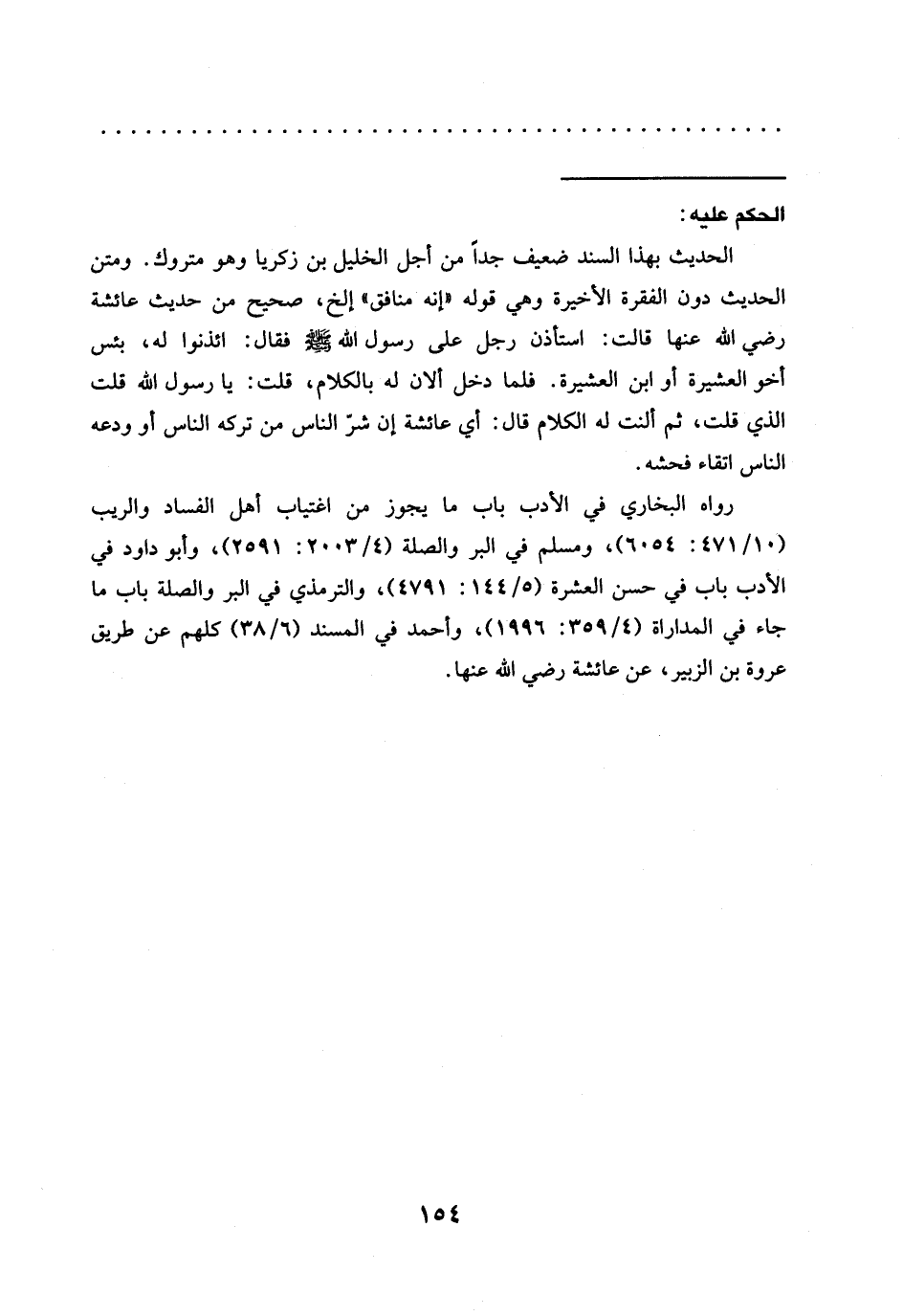 رواه البخاريُّ في الأدب باب ما يجوز من اغتياب أهل الفساد والريب (10/ 471: 6054)، ومسلم في البر والصلة (4/ 2003: 2591)، وأبو داود في الأدب باب في حسن العشرة (5/ 144: 4791)، والترمذي في البر والصلة باب ما جاء في المداراة (4/ 359: 1996)، وأحمد في المسند (6/ 38) كلهم عن طريق عروة بْنِ الزُّبَيْرِ، عَنْ عَائِشَةَ رَضِيَ اللَّهُ عَنْهَا.