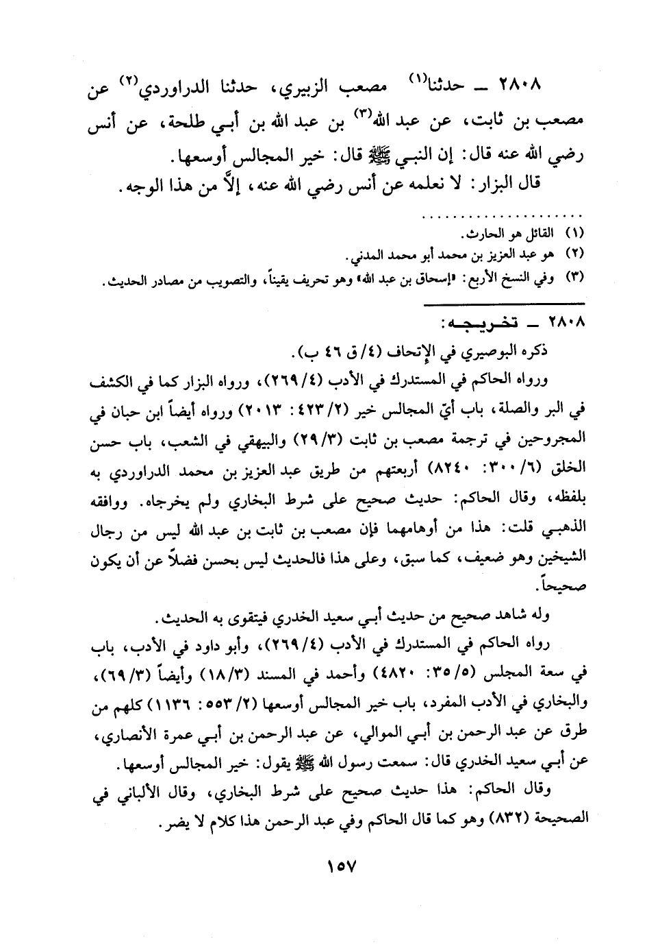 2808 - حَدَّثَنَا مُصْعَبٌ الزُّبَيْرِيُّ، حدثنا الدَّرَاوَرْدِيُّ عَنْ مُصْعَبِ بْنِ ثَابِتٍ، عَنْ عَبْدِ الله بن عبد اللَّهِ بْنِ أَبِي طَلْحَةَ، عَنْ أنس رَضِيَ الله عَنْه قال: إن النبي صَلَّى اللَّهُ عَلَيْهِ وَسَلَّمَ قَالَ: §خَيْرُ الْمَجَالِسِ أَوْسَعُهَا.