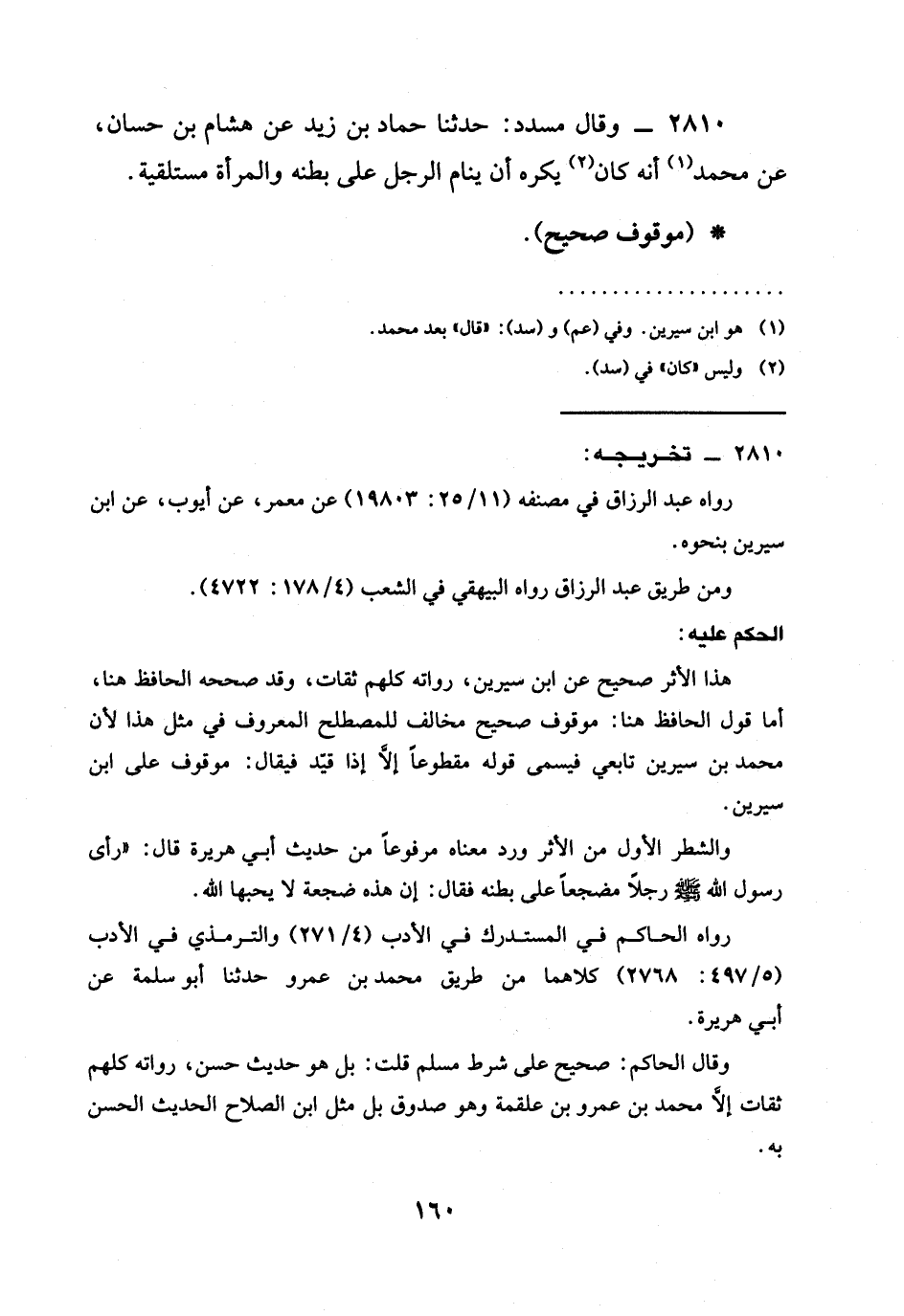 2810 - وقال مُسَدَّدٌ: حدثنا حَمَّادُ بْنُ زَيْدٍ عَنْ هِشَامِ بْنِ حَسَّانَ، عَنْ محمد §أنه كان يَكْرَهُ أَنْ يَنَامَ الرَّجُلُ عَلَى بَطْنِهِ وَالْمَرْأَةُ مُسْتَلْقِيَةً.