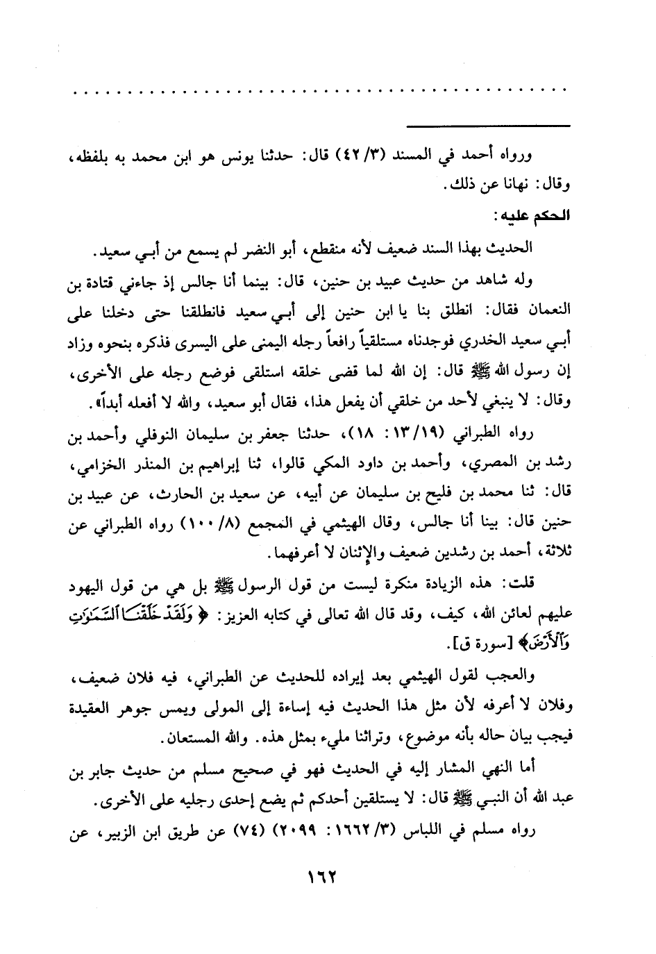والعجب لقول الهيثمي بعد إيراده للحديث عن الطبراني، فيه فلان ضعيف، وفلان لا أعرفه لأنّ مثل هذا الحديث فيه إساءة إلى المولى ويمس جوهر العقيدة فيجب بيان حاله بأنه موضوع، وتراثنا مليء بمثل هذه. والله المستعان.