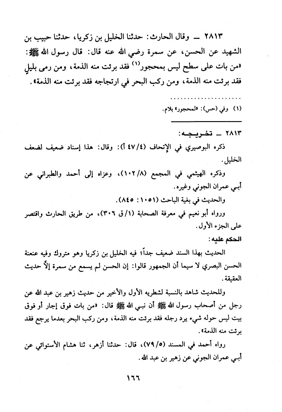 2813 - وَقَالَ الْحَارِثُ: حدثنا الْخَلِيلُ بْنُ زَكَرِيَّا، حدثنا حَبِيبُ بْنُ الشَّهِيدِ عَنِ الْحَسَنِ، عَنْ سَمُرَةَ رَضِيَ الله عَنْه قَالَ: قَالَ رَسُولُ اللَّهِ صَلَّى اللَّهُ عَلَيْهِ وَسَلَّمَ: " §مَنْ بَاتَ عَلَى سَطْحٍ لَيْسَ بِمَحْجُورٍ فَقَدْ بَرِئَتْ مِنْهُ الذِّمَّةُ، وَمَنْ رَمَى بِلَيْلٍ فَقَدْ بَرِئَتْ مِنْهُ الذِّمَّةُ، وَمَنْ رَكِبَ الْبَحْرَ فِي ارْتِجَاجِهِ فَقَدْ بَرِئَتْ مِنْهُ الذِّمَّةُ ".