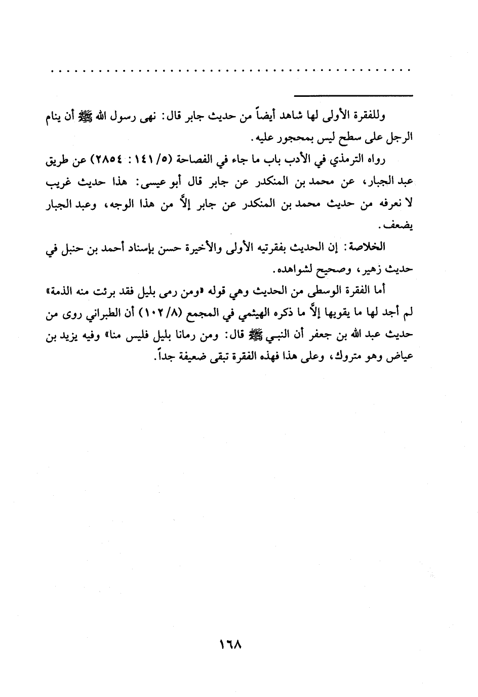 = وللفقرة الأولى لها شاهد أيضًا من حديث جابر قَالَ: نَهَى رَسُولُ اللَّهِ -صَلَّى اللَّهُ عَلَيْهِ وسلم- أن ينام الرجل على سطح ليس بمحجور عليه.