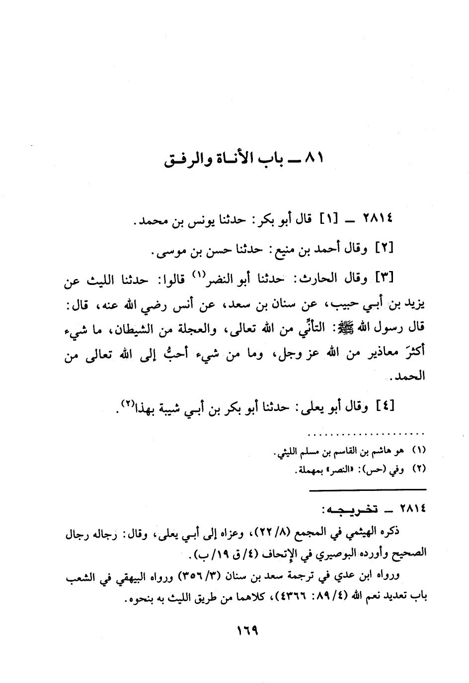 [3] وَقَالَ الْحَارِثُ: حدثنا أَبُو النضر قالوا: حدثنا الليث عَنْ يَزِيدَ بْنِ أَبِي حَبِيبٍ، عَنْ سنان بن سعد، عَنْ أَنَسٍ رَضِيَ الله عَنْه، قَالَ: قَالَ رَسُولُ اللَّهِ صَلَّى اللَّهُ عَلَيْهِ وَسَلَّمَ: §التَّأَنِّي من الله تعالى، وَالْعَجَلَةُ مِنَ الشَّيْطَانِ، ما شَيْءٌ أَكْثَرُ مَعَاذِيرَ من الله عز وجل، وَمَا مِنْ شَيْءٍ أَحَبُّ إلى الله تعالى مِنَ الْحَمْدِ.