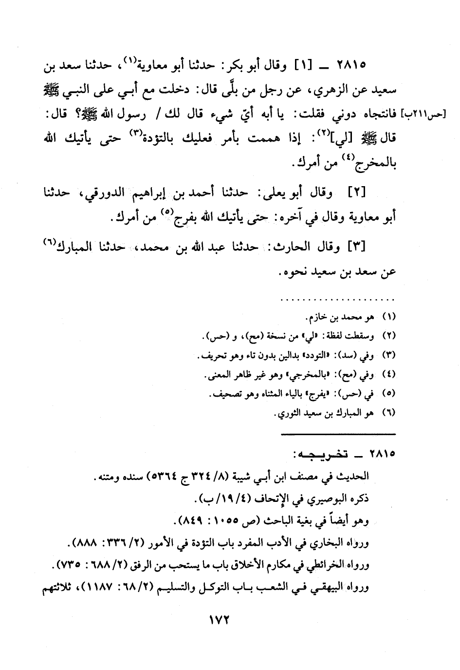2815 -[1] وَقَالَ أَبُو بَكْرٍ: حدثنا أَبُو مُعَاوِيَةَ، حدثنا سَعْدُ بْنُ سَعِيدٍ عَنِ الزُّهْرِيِّ، عَنْ رَجُلٍ مِنْ بَلِيٍّ قَالَ: دَخَلْتُ مَعَ أبي على النبي صَلَّى اللَّهُ عَلَيْهِ وَسَلَّمَ فَانْتَجَاهُ دُونِي فَقُلْتُ: يَا أَبَهْ أَيَّ شيء قال لك / رَسُولُ الله صَلَّى اللَّهُ عَلَيْهِ وَسَلَّمَ؟ قال: قال صَلَّى اللَّهُ عَلَيْهِ وَسَلَّمَ [لي] : §إِذَا هَمَمْتَ بِأَمْرٍ فَعَلَيْكَ بِالتُّؤَدَةِ حَتَّى يَأْتِيَكَ اللَّهُ بِالْمَخْرَجِ مِنْ أَمْرِكَ.