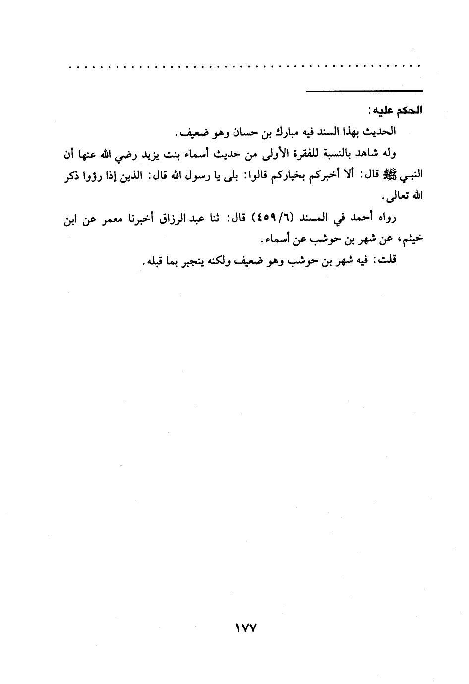 وله شاهد بالنسبة للفقرة الأولى من حديث أسماء بنت يزيد رضي الله عنها أن النبي -صلى الله عليه وسلم- قال: أَلَا أُخْبِرُكُمْ بِخِيَارِكُمْ قَالُوا: بَلَى يَا رَسُولَ الله قال: الذين إذا رؤوا ذكر الله تعالى.