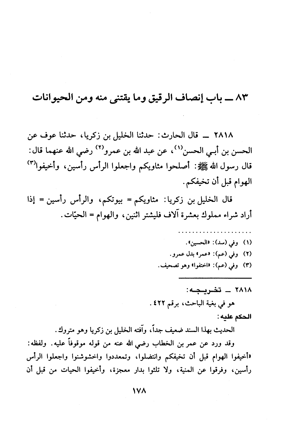 2818 - قَالَ الْحَارِثُ: حدثنا الْخَلِيلُ بْنُ زَكَرِيَّا، حدثنا عَوْفٌ عَنِ الْحَسَنِ بْنِ أَبِي الْحَسَنِ، عَنْ عَبْدِ اللَّهِ بن عمرو رَضِيَ الله عَنْهما قَالَ: قَالَ رَسُولُ اللَّهِ صَلَّى اللَّهُ عَلَيْهِ وَسَلَّمَ: §أَصْلِحُوا مَثَاوِيَكُمْ وَاجْعَلُوا الرَّأْسَ رَأْسَيْنِ، وَأَخِيفُوا الْهَوَامَّ قَبْلَ أَنْ تُخِيفَكُمْ.