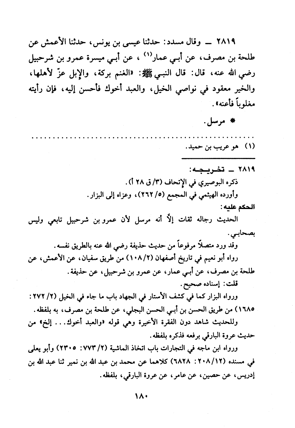2819 - وقال مُسَدَّدٌ: حدثنا عِيسَى بْنُ يُونُسَ، حدثنا الْأَعْمَشُ عَنْ طَلْحَةَ بْنِ مُصَرِّفٍ، عن أبي عمار، عَنْ أَبِي مَيْسَرَةَ عَمْرِو بْنِ شُرَحْبِيلَ رَضِيَ الله عَنْه، قَالَ: قَالَ النَّبِيُّ صَلَّى اللَّهُ عَلَيْهِ وَسَلَّمَ: " §الْغَنَمُ بَرَكَةٌ، وَالْإِبِلُ عِزٌّ لِأَهْلِهَا، وَالْخَيْرُ مَعْقُودٌ فِي نَوَاصِي الْخَيْلِ، وَالْعَبْدُ أَخُوكَ فَأَحْسِنْ إِلَيْهِ، فَإِنْ رَأَيْتَهُ مَغْلُوبًا فَأَعِنْهُ ".