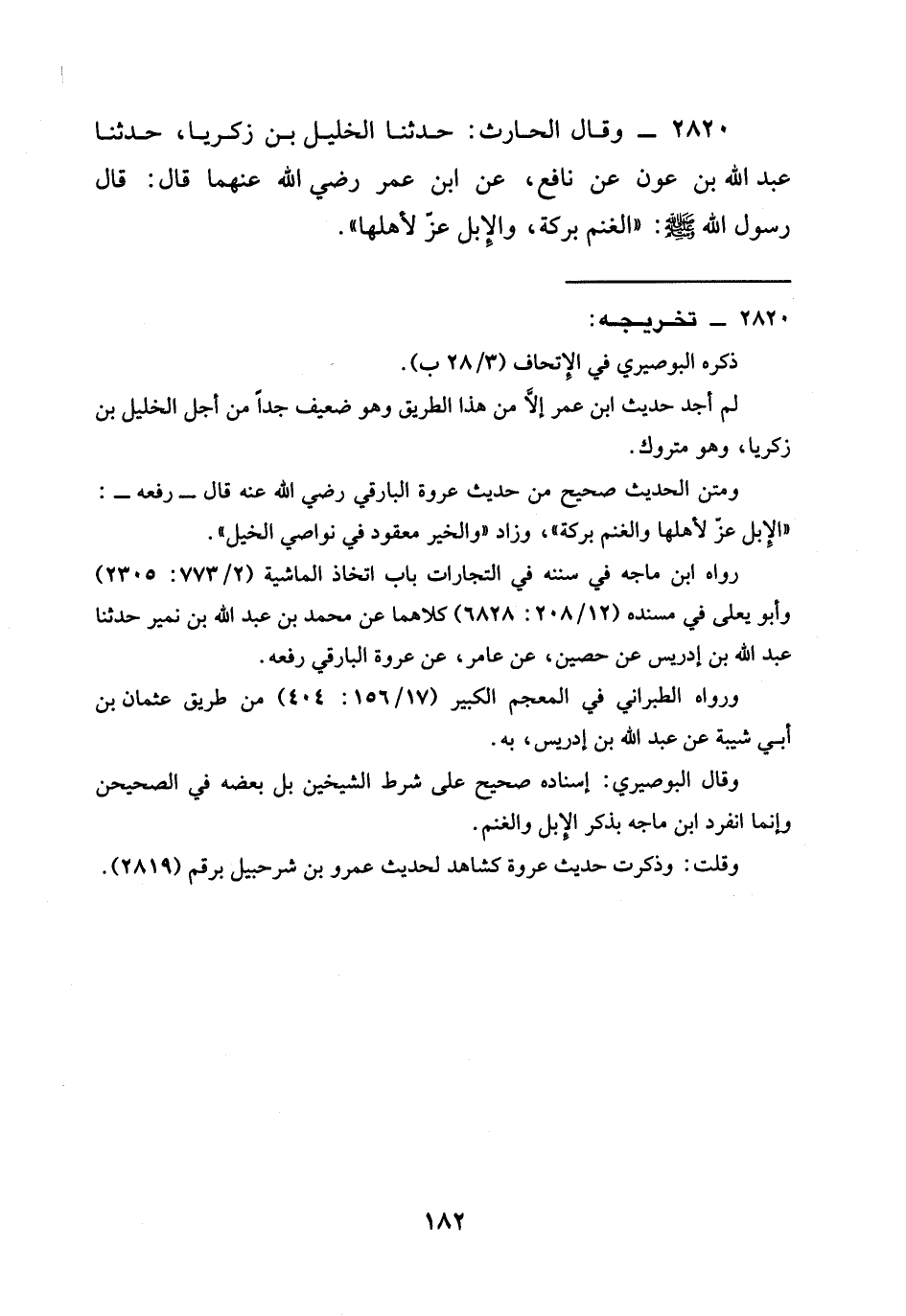 2820 - وَقَالَ الْحَارِثُ: حدثنا الْخَلِيلُ بْنُ زَكَرِيَّا، حدثنا عَبْدُ اللَّهِ بْنُ عَوْنٍ عَنْ نَافِعٍ، عَنِ ابن عمر رَضِيَ الله عَنْهما قَالَ: قَالَ رَسُولُ اللَّهِ صَلَّى اللَّهُ عَلَيْهِ وَسَلَّمَ: " §الْغَنَمُ بَرَكَةٌ، وَالْإِبِلُ عِزٌّ لِأَهْلِهَا ".