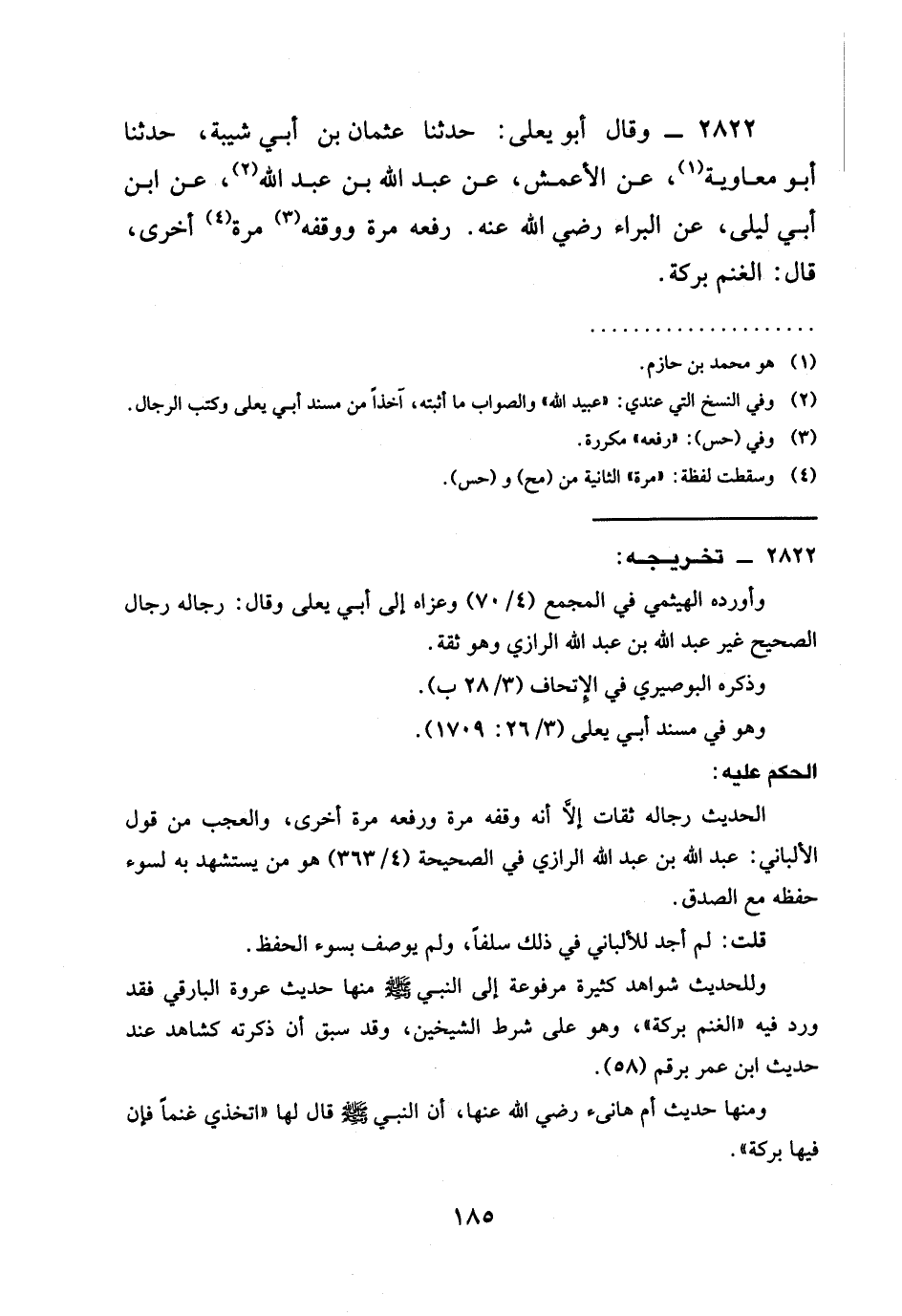 2822 - وَقَالَ أَبُو يَعْلَى: حدثنا عُثْمَانُ بْنُ أَبِي شَيْبَةَ، حدثنا أَبُو مُعَاوِيَةَ، عَنِ الْأَعْمَشِ، عَنْ عَبْدِ اللَّهِ بْنِ عَبْدِ اللَّهِ، عَنِ ابْنِ أَبِي لَيْلَى، عَنِ الْبَرَاءِ رَضِيَ الله عَنْه. رَفَعَهُ مرة ووقفه مَرَّةً أُخْرَى، قَالَ: §الْغَنَمُ بَرَكَةٌ.