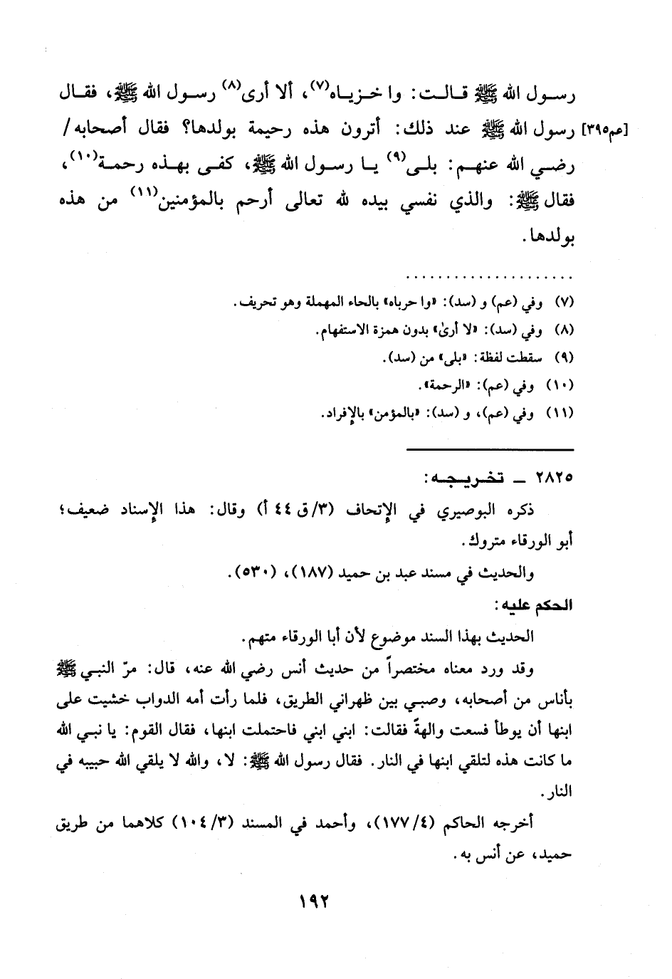 رَسُولِ اللَّهِ -صَلَّى اللَّهُ عَلَيْهِ وَسَلَّمَ- قَالَتْ: واخزياه (¬7)، أَلَا أَرَى (¬8) رَسُولَ اللَّهِ -صَلَّى اللَّهُ عَلَيْهِ وَسَلَّمَ-، فَقَالَ رَسُولُ اللَّهِ -صَلَّى اللَّهُ عَلَيْهِ وَسَلَّمَ- عِنْدَ ذَلِكَ: أَتَرَوْنَ هَذِهِ رَحِيمَةً بِوَلَدِهَا؟ فقال أصحابه رضي الله عنهم: بلى (¬9) يا رسول الله -صلى الله عليه وسلم-، كفى بهذه رحمة (¬10) فَقَالَ -صَلَّى اللَّهُ عَلَيْهِ وَسَلَّمَ-: وَالَّذِي نَفْسِي بِيَدِهِ لله تعالى أرحم بالمؤمنين (¬11) من هذه بولدها.