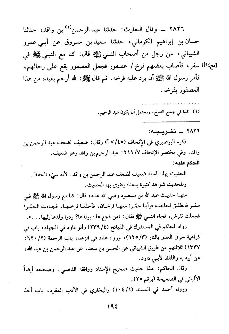 2826 - وقال الْحَارِثُ: حَدَّثَنَا عَبْدُ الرحمن بْنُ وَاقِدٍ، حدثنا حَسَّانُ بْنُ إِبْرَاهِيمَ الْكَرْمَانِيُّ، حَدَّثَنَا سَعِيدُ بْنُ مَسْرُوقٍ عَنْ أَبِي عَمْرٍو الشَّيْبَانِيِّ، عَنْ رَجُلٍ مِنْ أَصْحَابِ النَّبِيِّ صَلَّى اللَّهُ عَلَيْهِ وَسَلَّمَ قَالَ: كُنَّا مَعَ النَّبِيِّ صَلَّى اللَّهُ عَلَيْهِ وَسَلَّمَ فِي سَفَرٍ، فَأَصَابَ بَعْضُهُمْ فَرْخَ / عُصْفُورٍ فَجَعَلَ الْعُصْفُورُ يَقَعُ عَلَى رِحَالِهِمْ، فَأَمَرَ رَسُولُ اللَّهِ صَلَّى اللَّهُ عَلَيْهِ وَسَلَّمَ أَنْ يُرَدَّ عليه فرخه، ثم قَالَ صَلَّى اللَّهُ عَلَيْهِ وَسَلَّمَ: §لَلَّهُ أَرْحَمُ بعبده مِنْ هَذَا الْعُصْفُورِ بِفَرْخِهِ.