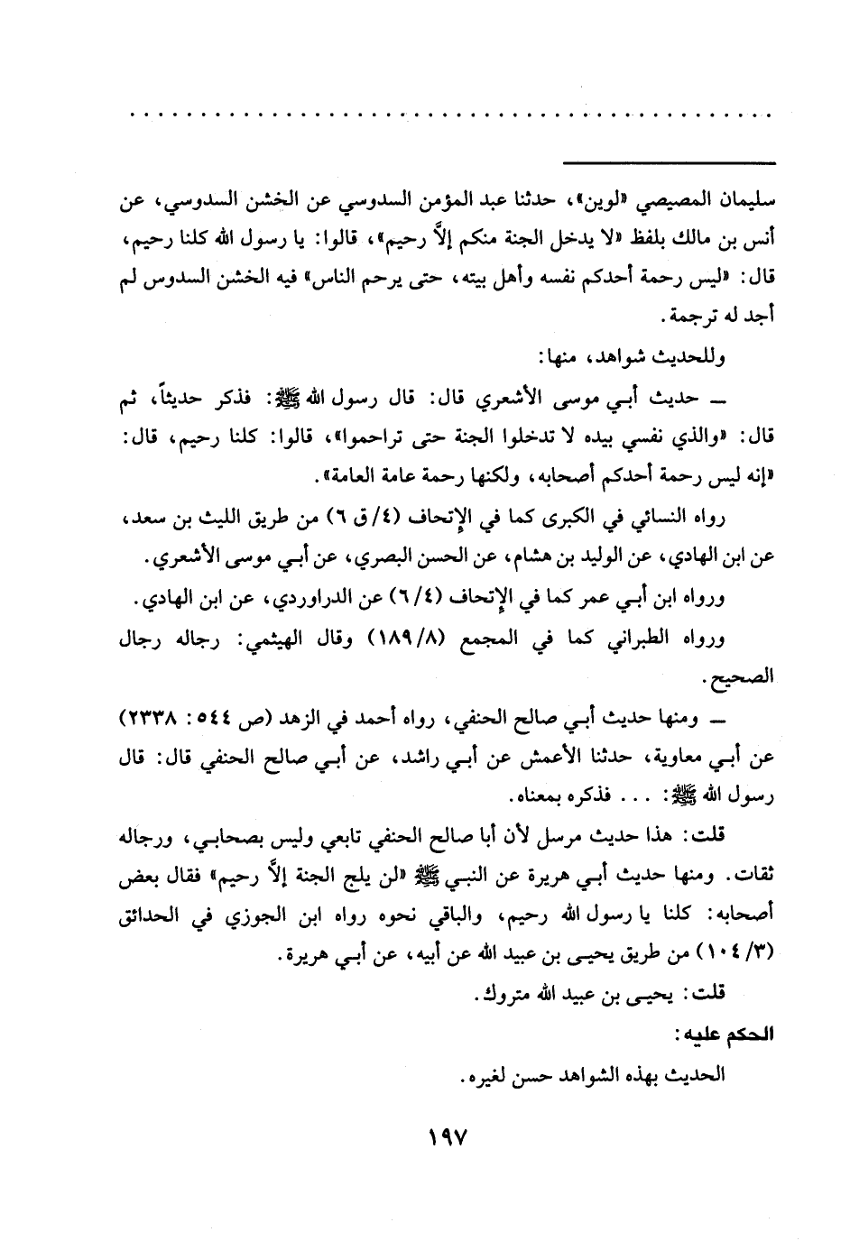 قلت: هذا حديث مرسل لأنّ أبا صالح الحنفي تابعي وليس بصحابي، ورجاله ثقات. ومنها حديث أَبِي هُرَيْرَةَ عَنِ النَّبِيِّ -صَلَّى اللَّهُ عَلَيْهِ وسلم- "لن يلج الجنة إلّا رحيم" فقال بعض أصحابه: كلنا يا رسول الله -صلى الله عليه وسلم-، والباقي نحوه رواه ابن الجوزي في الحدائق (3/ 104) من طريق يَحْيَى بْنِ عُبَيْدِ اللَّهِ عَنْ أَبِيهِ، عَنْ أبي هريرة.