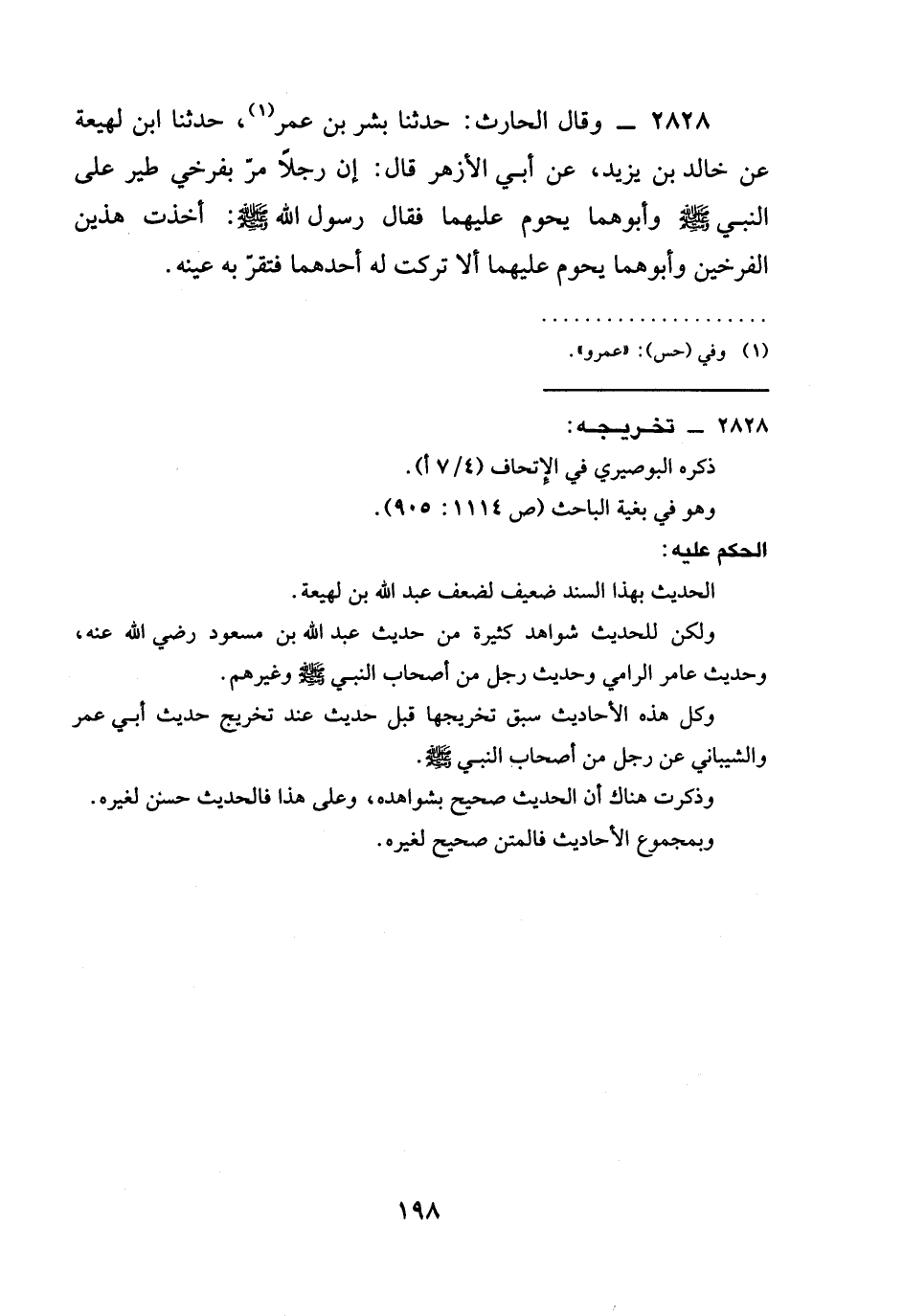 2828 - وقال الحارث: حدثنا بشر بن عمر، حدثنا ابْنُ لَهِيعَةَ عَنْ خَالِدِ بْنِ يَزِيدَ، عَنْ أَبِي الْأَزْهَرِ ِقال: إنَّ رَجُلًا مَرَّ بِفَرْخَيْ طير على النبي صَلَّى اللَّهُ عَلَيْهِ وَسَلَّمَ وَأَبُوهُمَا يَحُومُ عَلَيْهِمَا فَقَالَ رَسُولُ اللَّهِ صَلَّى اللَّهُ عَلَيْهِ وَسَلَّمَ: أَخَذْتُ هَذَيْنِ الْفَرْخَيْنِ وَأَبُوهُمَا يَحُومُ عَلَيْهِمَا أَلَا تَرَكْتَ لَهُ أَحَدَهُمَا فَتَقَرَّ بِهِ عَيْنُهُ.