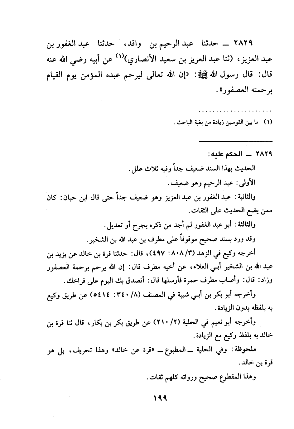 2829 - حَدَّثَنَا عَبْدُ الرَّحِيمِ بْنُ وَاقِدٍ، حدثنا عَبْدُ الغفور بْنُ عبد العزيز، (ثنا عَبْدُ الْعَزِيزِ بْنُ سَعِيدٍ الْأَنْصَارِيُّ) عَنْ أَبِيهِ رَضِيَ الله عَنْه قَالَ: قَالَ رَسُولُ اللَّهِ صَلَّى اللَّهُ عَلَيْهِ وَسَلَّمَ: " §إن الله تعالى لَيَرْحَمُ عَبْدَهُ الْمُؤْمِنَ يَوْمَ القيام بِرَحْمَتِهِ الْعُصْفُورَ ".
