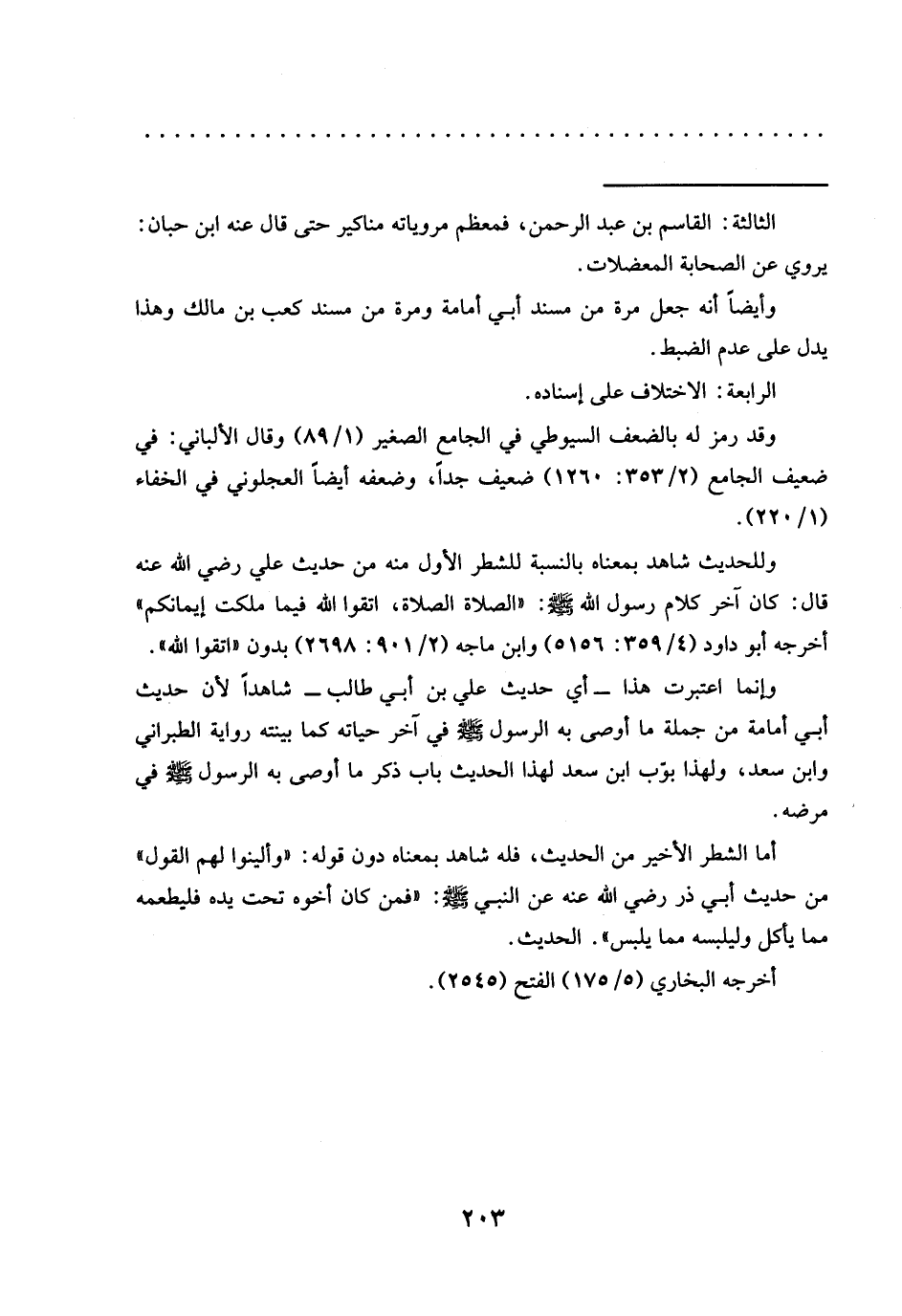 وإنما اعتبرت هذا -أي حديث علي بن أبي طالب- شاهدا لأنّ حديث أبي أمامة من جملة ما أوصى به الرسول -صلى الله عليه وسلم- في آخر حياته كما بينته رواية الطبراني وابن سعد، ولهذا بوّب ابن سعد لهذا الحديث باب ذكر ما أوصى به الرسول -صلى الله عليه وسلم- في مرضه.